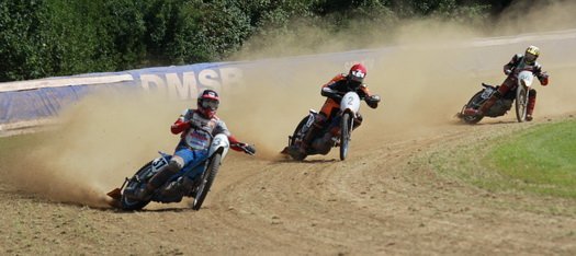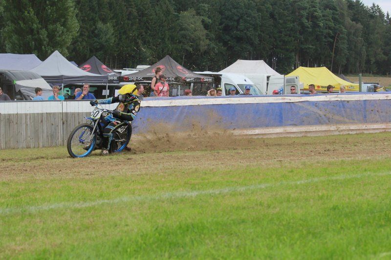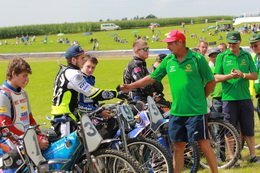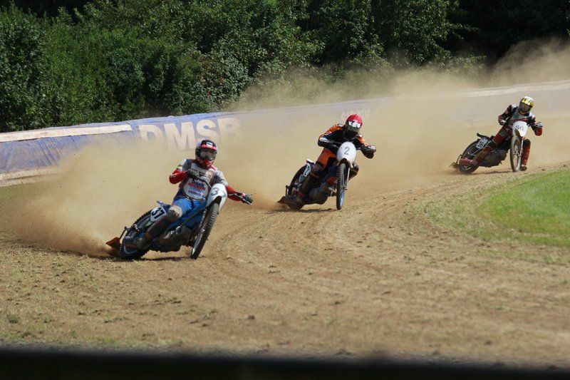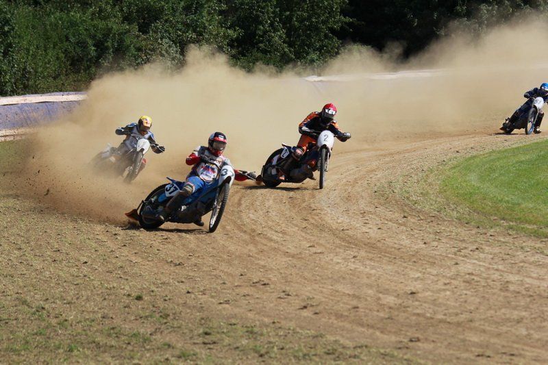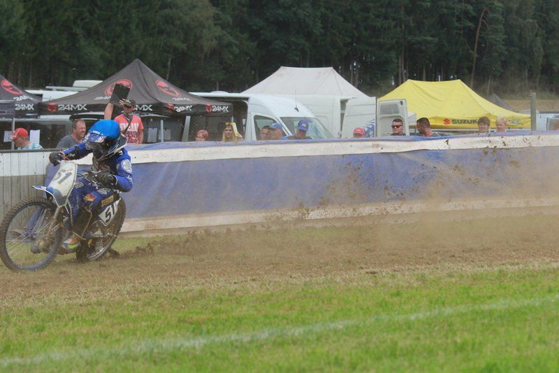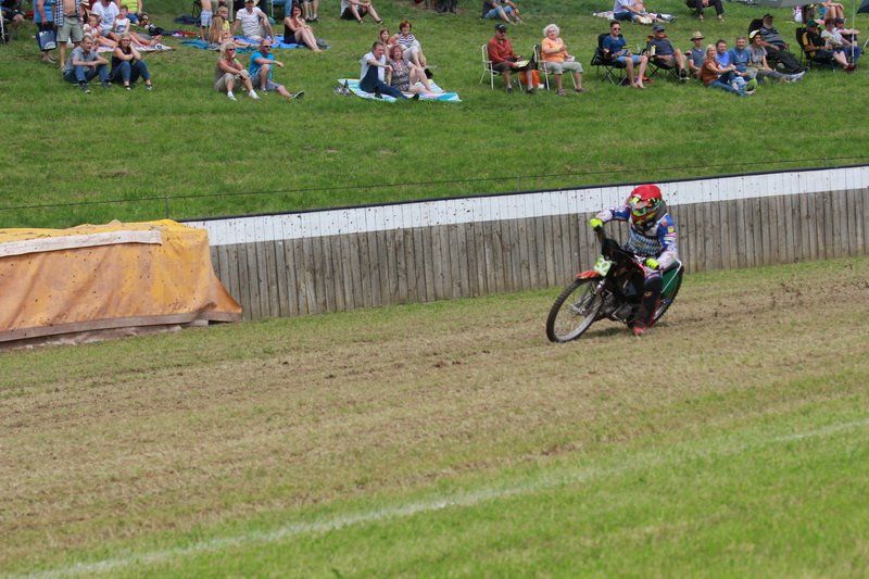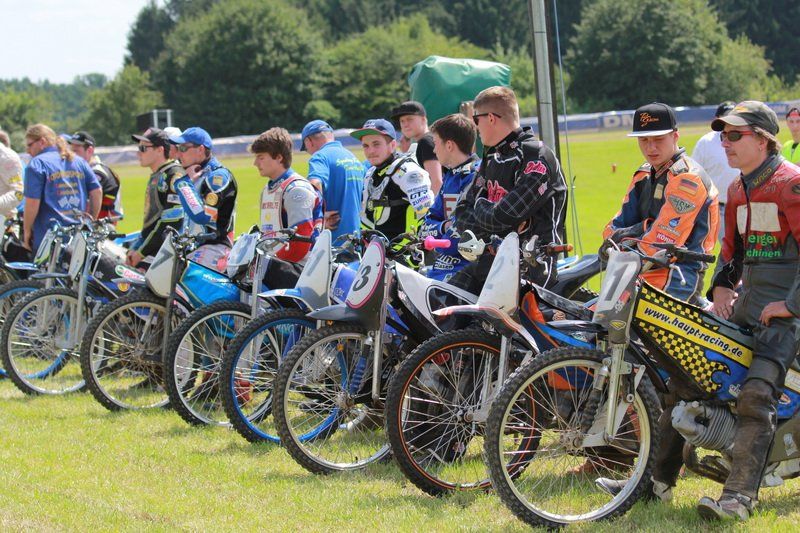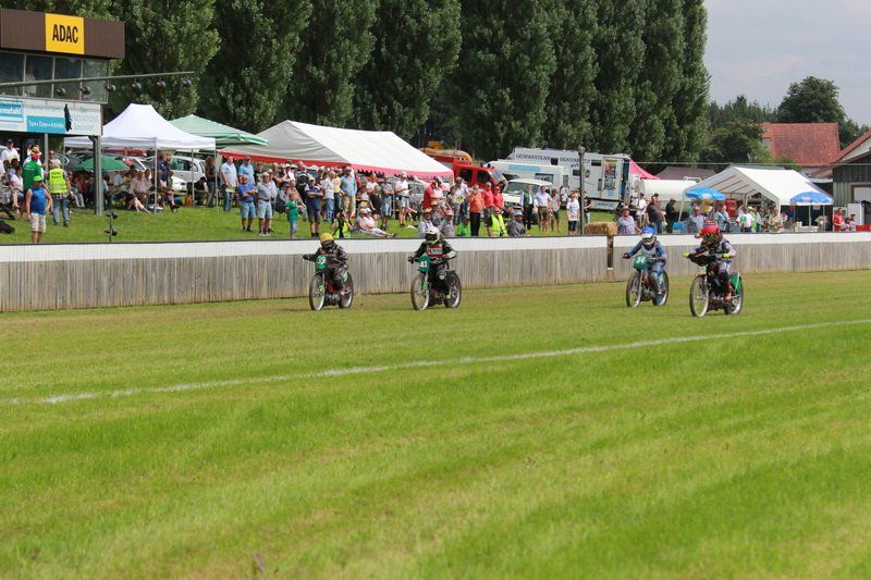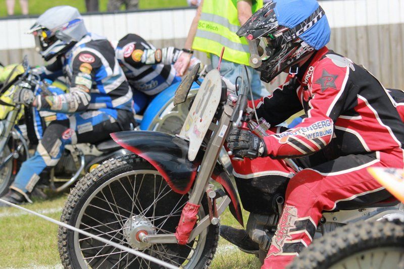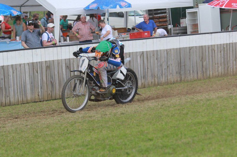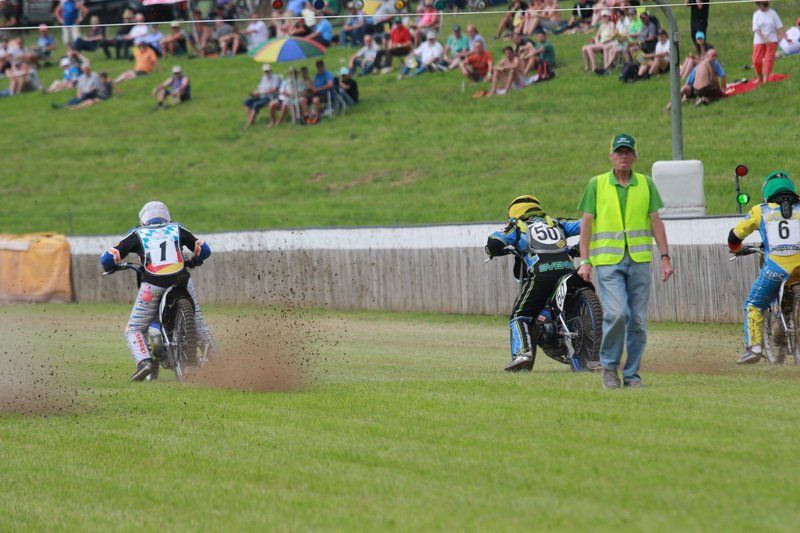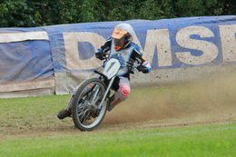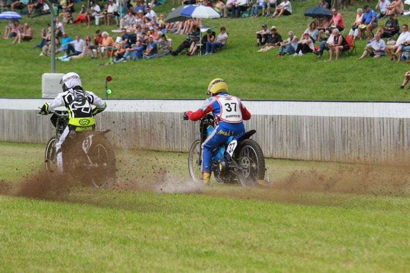 Pünktlich um 13.30 Uhr war es dann auch so weit und die ersten Fahrer begaben sich auf die Strecke. Vier Runden galt es zu absolvieren und nach Möglichkeit dann auch als erster über die Ziellinie zu rasen. Philipp Schmuttermayr zeigte in den Vorläufen, was den Bahnsport ausmacht. Mit einigen gewagten Überholmanövern setzte er mit insgesamt drei Siegen nach sechs Läufen ein deutliches Zeichen. Insgesamt 15 Punkte hatte Schmuttermayr so gesammelt und lag damit an der Spitze. Tim Brinkmann und Dennis Helfer lagen mit je 13 Punkten nach dem Vorläufen auf Platz zwei, dicht gefolgt von Fabian Wachs mit 11 Punkten.