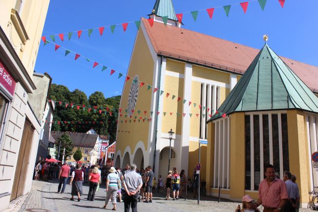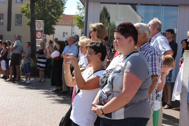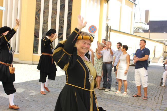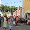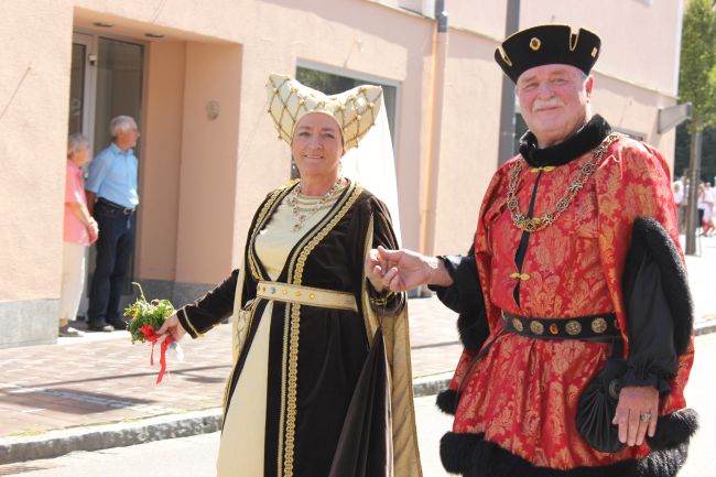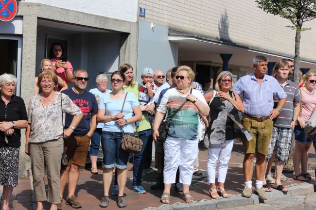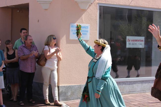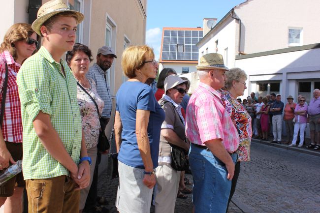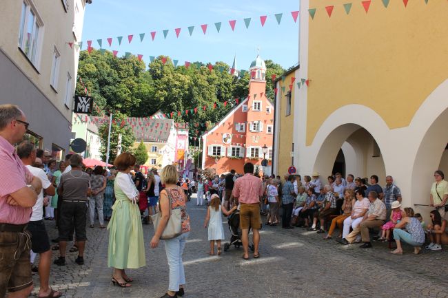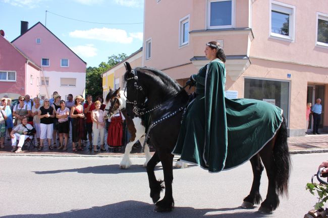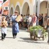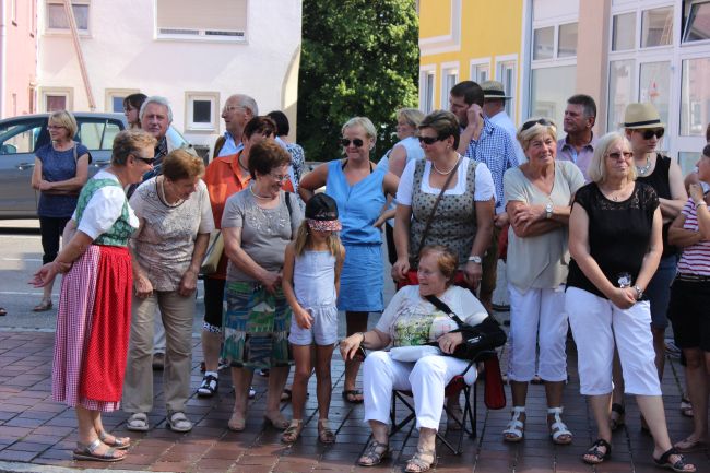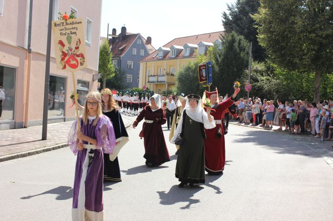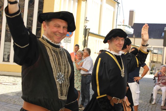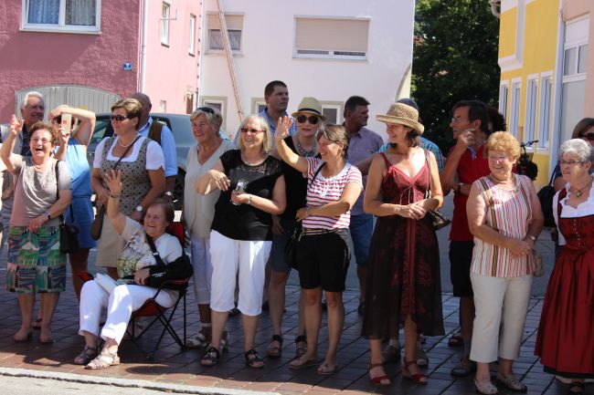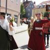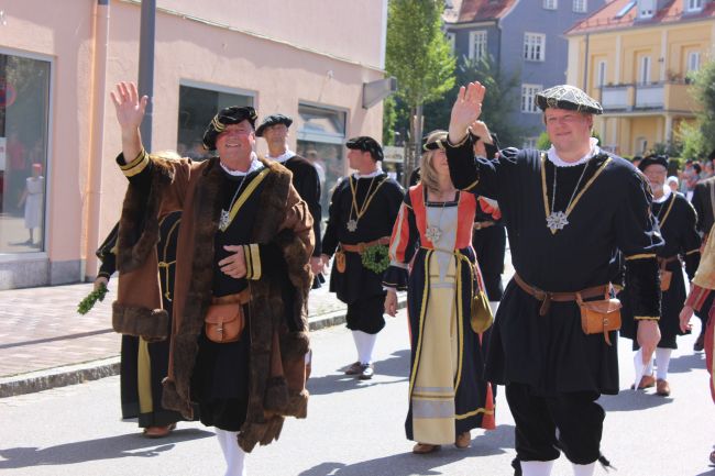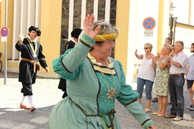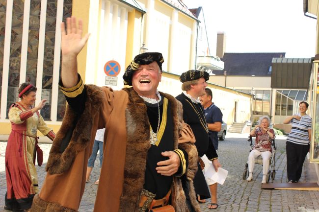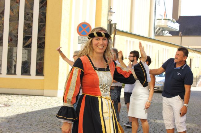 Trotz der Hitze wollten viele sich das einmalige Spektakel nicht entgehen lassen. 1. Bürgermeister Sepp Reiser, der im Fürstengewand auftrat, zeigte sich ebenso wie seine Stellvertreterin „Burgfräulein“ Hannelore Langwieser und eine Abordnung von Stadträten, alle ausnahmslos in antikem „Outfit“.