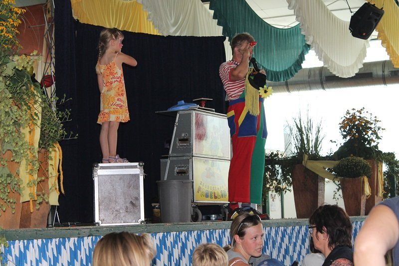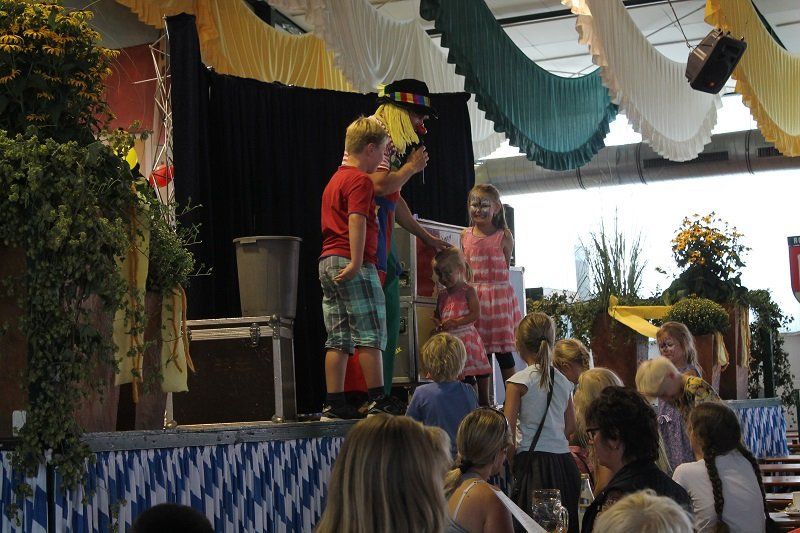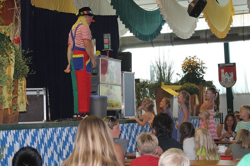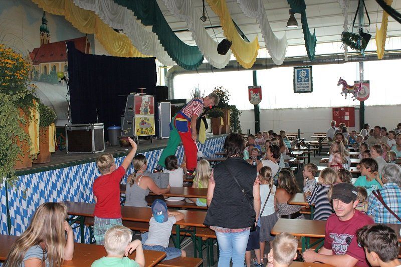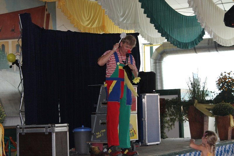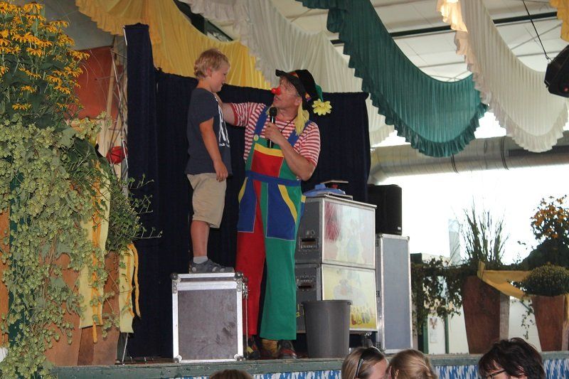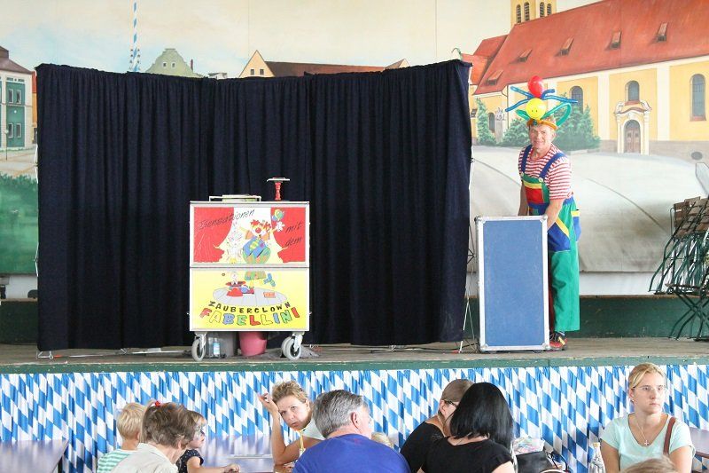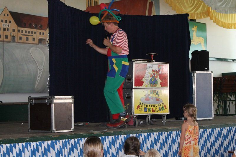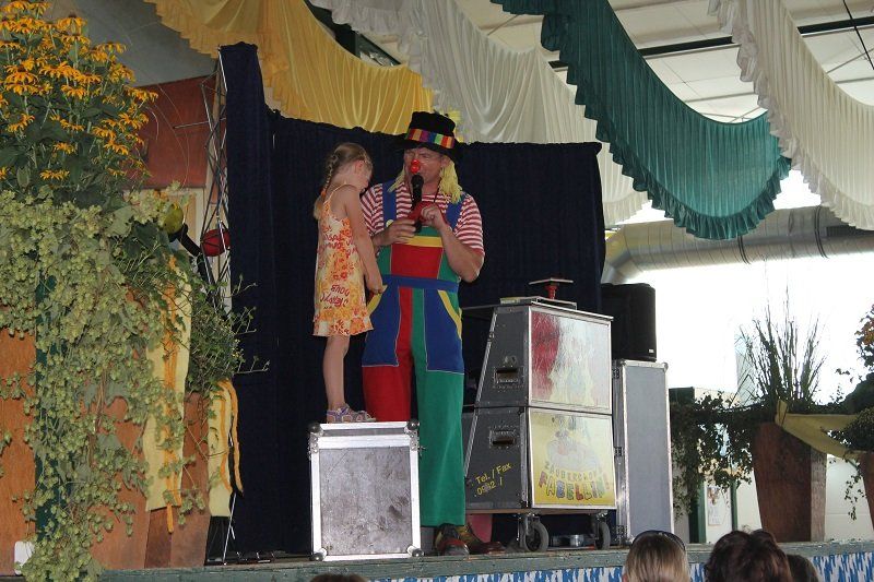 Neu in diesem Jahr war die Show von Zauberclown Fabellini. Nachdem der Clown höchstpersönlich auf dem Volksfestplatz mit Mikrofon und Musikanlage versucht hatte, die Kinder die noch nicht in der Hopfenhalle waren, mitzunehmen, waren die Bänke vor der Bühne doch sehr gut gefüllt. Genauso gefüllt wie sein Repertoire mit dem er nicht nur die Kinder, sondern auch die anwesenden Erwachsenen sowohl zum Lachen, als auch zum Staunen brachte.