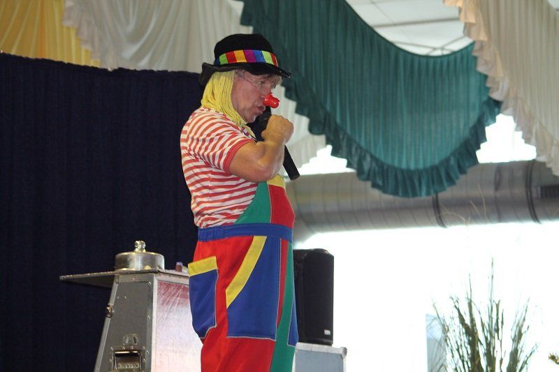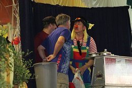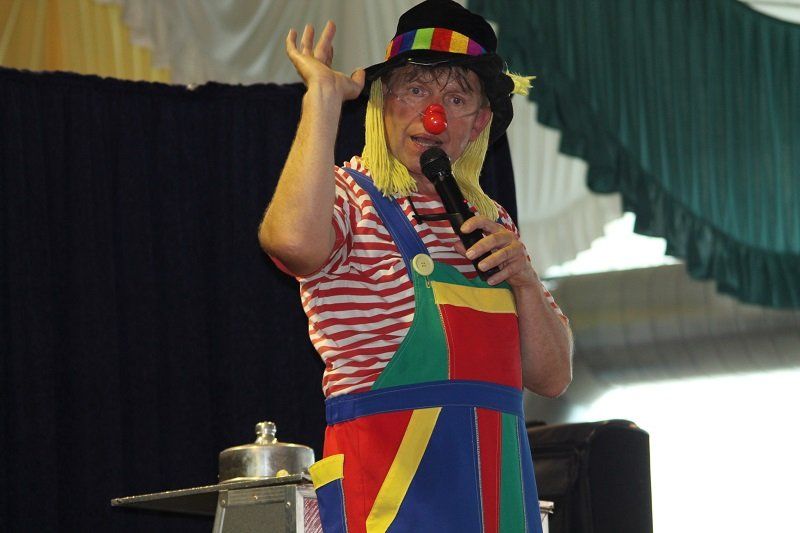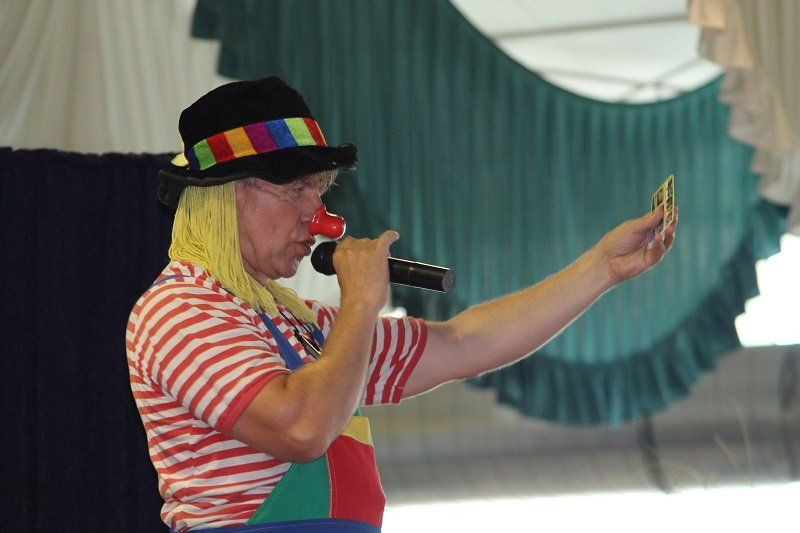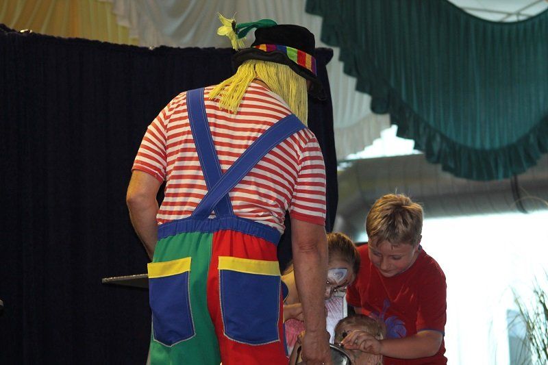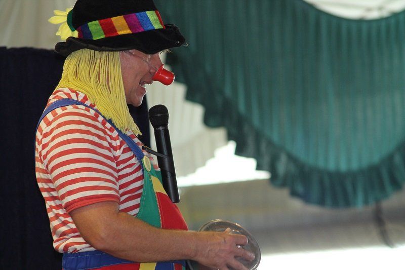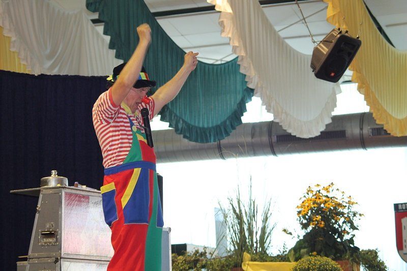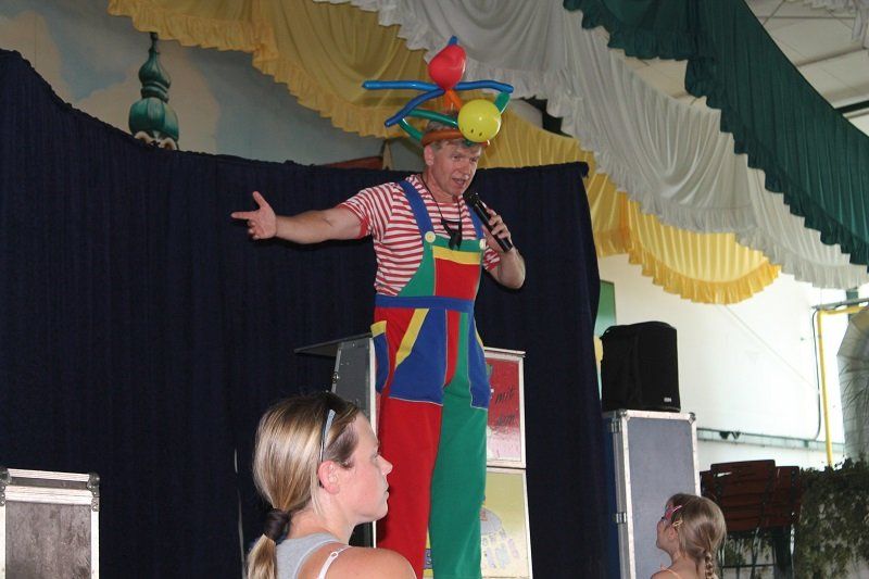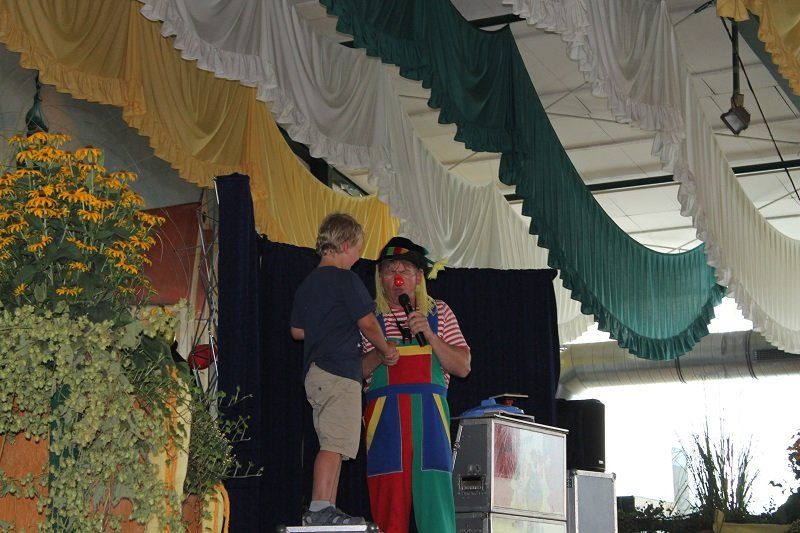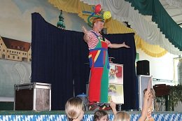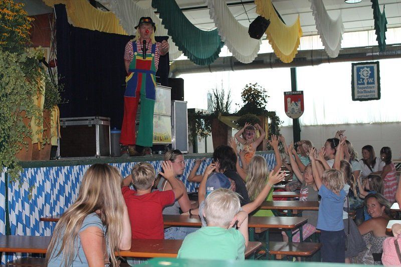 Neu in diesem Jahr war die Show von Zauberclown Fabellini. Nachdem der Clown höchstpersönlich auf dem Volksfestplatz mit Mikrofon und Musikanlage versucht hatte, die Kinder die noch nicht in der Hopfenhalle waren, mitzunehmen, waren die Bänke vor der Bühne doch sehr gut gefüllt. Genauso gefüllt wie sein Repertoire mit dem er nicht nur die Kinder, sondern auch die anwesenden Erwachsenen sowohl zum Lachen, als auch zum Staunen brachte.
