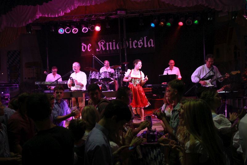 Aber nicht nur der letzte Tag war dieses Mal ein ganz besonderer, sondern auch das ganze Volksfest. „Elf Tage, und wo man hinschaut nur fröhliche Menschen“, so das Fazit von Bürgermeister Jens Machold. Ein Fazit, das auch Michael Fricke seitens des Marktverwaltung nur bestätigen konnte. „Es gab in diesem Jahr keine polizeilichen Vorkommnisse.“ Man hat einfach miteinander gefeiert und alles andere für die Zeit der Wolnzacher Wies'n zurückgestellt. Und so war es natürlich klar, dass auch am letzten Tag, am „Kniabiesla-Dog“ noch einmal die Halle nicht nur voll ist, sondern zum Beben gebracht wird. Klaus, Jürgen, Dieter, Sigi, Reinhold und Jessica sorgten schnell nicht nur für beste Stimmung unter den zahlreichen Partygästen, sondern brachten Schankkellner Max Meier auf zwischenzeitlich dazu, den Zapfhahn gegen eine Luftgitarre einzutauschen.