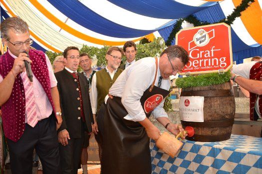 Mit nur zwei Schlägen schaffte es Manchings Bürgermeister Herbert Nerb (FW) das erste Bierfass im Festzelt der Graf-Toerring-Brauerei anzuzapfen - womit der diesjährige Barthelmarkt in Oberstimm als eines der größten Volksfeste in Oberbayeren seit dem heutigen Freitagnachmittag auch offiziell eröffnet ist.