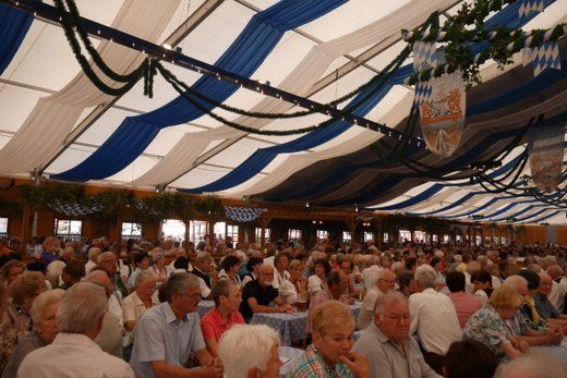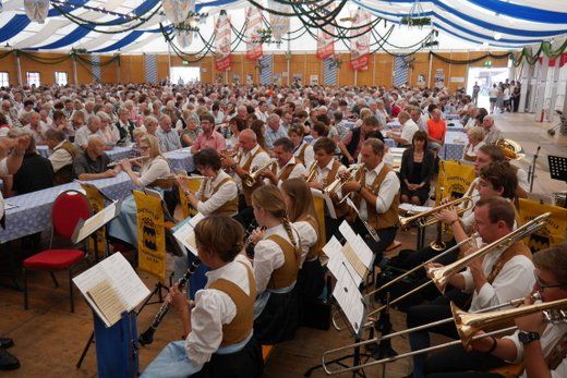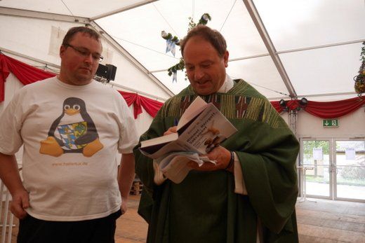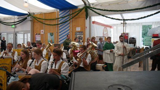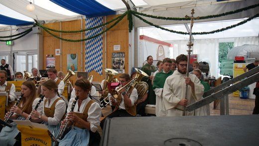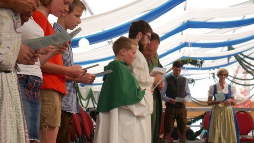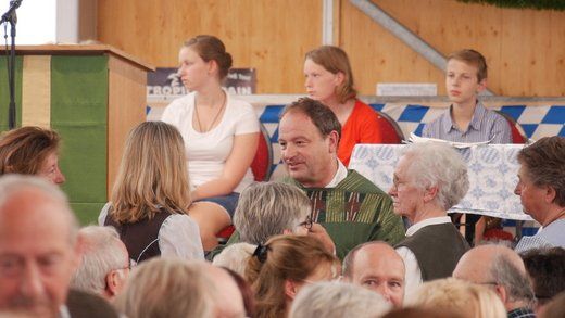 Alle immer sitzen bleiben, denn wenn vier auf einer Bierbank aufstehen, bleibt meistens einer sitzen, wer unbedingt knien will, soll das bitte im Mittelgang machen, sonst kommt die Bedienung nicht durch, der Pfarrer der auch Oktoberfesterfahrung im Service hat, weiß von was er spricht. Schon als Baby war er in Pfaffenhofen, eine familiäre Bindung nach Uttenhofen ist nie abgerissen und es ist einfach schön, als Pfarrer zurückzukehren, noch dazu auf Einladung des Pfarrgemeinderates, ins Bierzelt. Die Erfahrung in einem Bierzelt predigen zu dürfen, empfiehlt er allen Berufsanfänger, im Glauben, hier oben auf der Bühne zu stehen wo sonst die Blasmusik spielt, ist der richtige Ort um das Wort Gottes zu verkündigen.