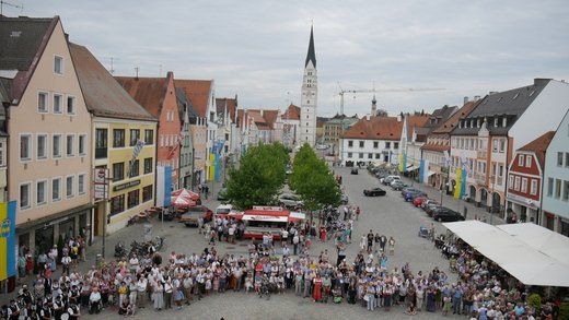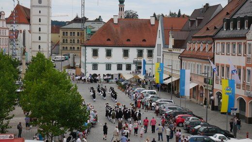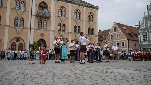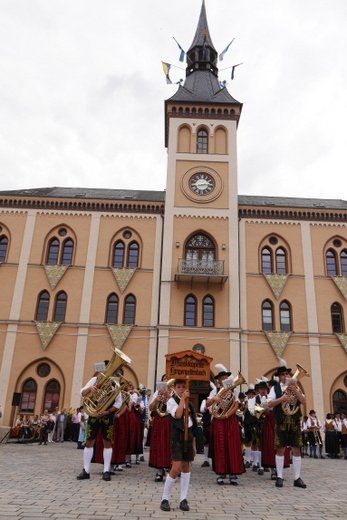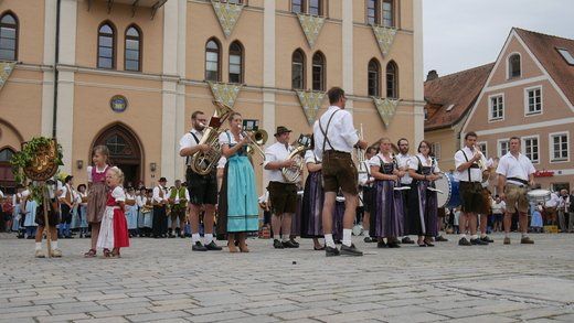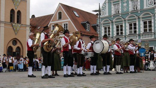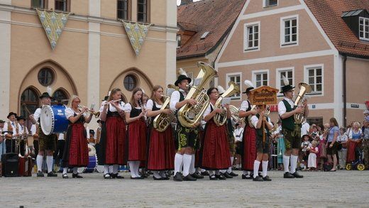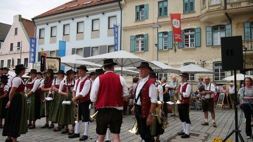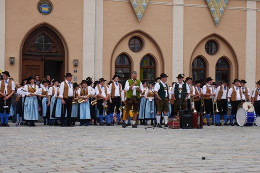 Am ersten Volksfestsonntag herrscht die Blasmusik in Pfaffenhofen. In der guten Stube der Stadt, vor dem Rathaus, spielen vielerlei Blaskapellen auf Einladung der Stadtkapelle und des Spielmannszuges Pfaffenhofen, ein meist lautstarkes Konzert.