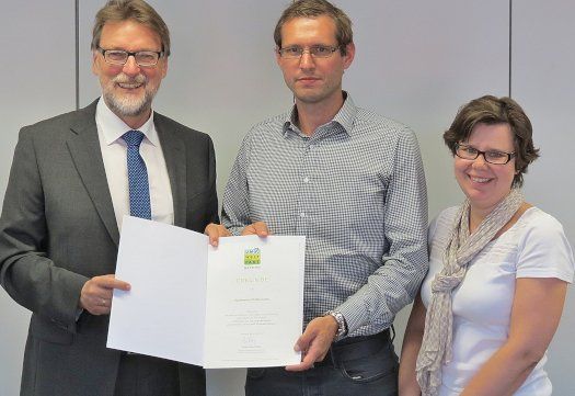 Landrat Martin Wolf (l.) Sebastian Brandmayr und Abteilungsleiterin Alexandra Schönauer vom Landratsamt bei der Übergabe der Umweltpakt-Urkunde. Foto: Rottler / Landratsamt Pfaffenhofen