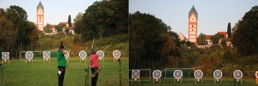 Der "Sportplatz an den Weihern" unterhalb des Klosters auf halbem Weg zum Prielhof musste angesichts der unerwartet hohen Teilnehmerzahl für die Schützen umfunktioniert werden. Die beginnende Abendsonne im Rücken und Zielscheiben ebenso wie Basilika in farbenfrohes Licht getaucht ließen sich die Schützen in ihren Durchgängen von der Schönheit der Natur um sie herum in keiner Wiese ablenken. Höchste Konzentration bei 2 x 30 Pfeilen auf die 30-Meter-Distanz war notwendig, um den Abend auch sportlich zu einem Erfolg werden zu lassen.