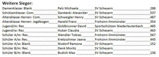 Im Hauptwettbewerb der Schützenklasse gewann Thomas Orel von Frohsinn Ilmmünster mit 570 von 600 möglichen Ringen. Dahinter reihten sich Robert Westermeier (SG Schüsselhausen Mainburg, 568) und Marko Kormansek (Sportschützen Niederlauterbach, 567) ein. Bei den Damen konnte sich Christine Kormansek (Sportschützen Niederlauterbach, 528) vor Birgit Walter (SV Scheyern, 499) und Rebecca Stotz (SG Schüsselhausen Mainburg, 409) durchsetzen. Mit Tobias Wendler von Frohsinn Ilmmünster ließ es sich in der Klasse Schüler A. Rec. Der amtierende deutsche Vizemeister seiner Klasse nicht nehmen, die einmalige Atmosphäre und die sportliche Herausforderung dieses Turniers zu genießen. Ein Nachtschießen ist ja auch nicht alle Tage angesagt.