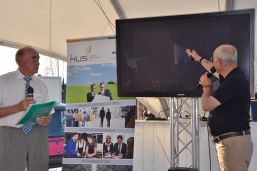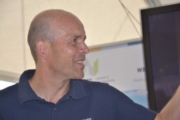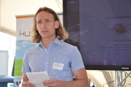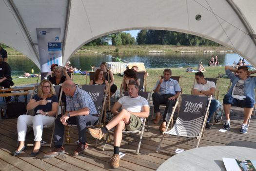 Eigenlich war das Gelände für eine solche Veranstaltung überhaupt nicht geeignet. Die eingeladenen Teilnehmer saßen unter einem offenen Zelt, das eigenlich zu Chillen am Wasser gedacht ist, auf Stühlen und teilweise auf Liegestühlen. Auf dem gesamten Gelände war aufgrund des tollen Sommerwetters Baden, Wasserski-Lauf und Stand-up-Paddeling angesagt und die Wassersportfreunde und Kinder liefen über das Gelände und am Zelt vorbei. – Andererseits war die Location ein idealer Platz, denn die gesamte Wasserski-Anlage besteht seit erst gerade mal einem Jahr und war auch eine Firmen-Neugründung. Und die Wassersportler, Badegäste und Kinder störten die Veranstaltung in keiner Weise, denn denen war das Wasser wichtiger als sich um brav sitzende Teilnehmer einer Veranstaltung zu kümmern.