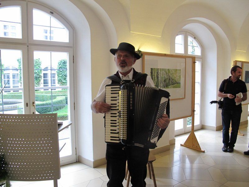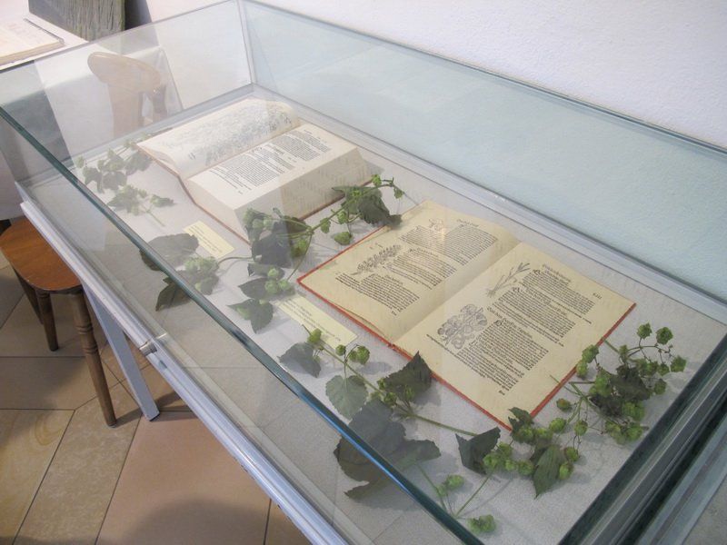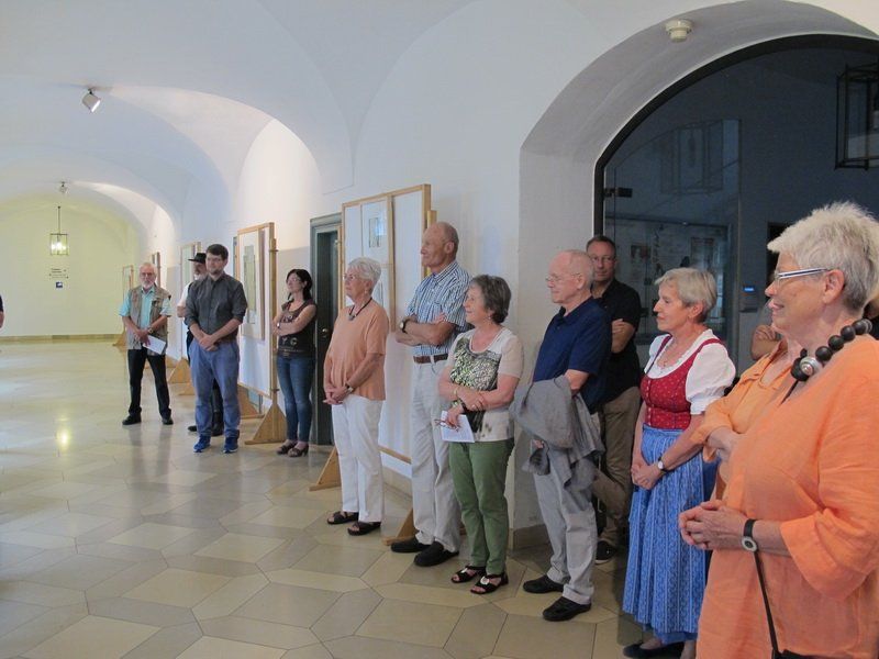 Zur Vernissage am Donnerstag stand der Hopfen voll im Mittelpunkt. Vitrinen mit Hopfensträußen, historische Literatur um Bier und Hopfen und ein Hopfenkranz ergänzten die Holzschnitte im Kreuzgang, ein Sänger trug das Hallertauer Lied vor, Rudolf Goerge würdigte die Künstlerin, nachdem seitens des Landratsamtes der Kontext der Ausstellung zu 500 Jahre Reinheitsgebot in Bayern hergestellte wurde – es betraf ja im Wesentlichen nur die Würzung.