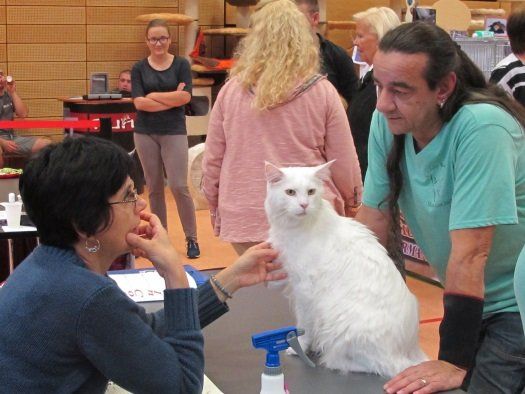 Besonderes Augenmerk war am heutigen Samstag auf die Rasse „Russisch Blau“ gerichtet, bei der die Katzen extra bewertet und prämiert worden sind. Für interessierte Besucher nehmen sich die Züchter und Katzenbesitzer trotz Ausstellungshektik ebenfalls Zeit und erzählen bereitwillig über Haltung, Aufzucht und Erfahrungen. Auch gewerbliche Anbieter haben ihre Stände aufgebaut und verkaufen alles vom Spezialfutter, Spielzeug bis zum überdimensionalen Kratzbaum.