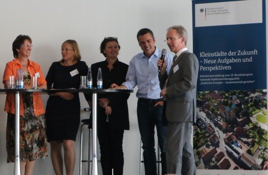 Bei der Abschlussdiskussion nach den Vorträgen in Hannover (von links): Sylke Hildebrandt (Stadt Pritzwalk), Dr. Sabine Michalek (Bürgermeisterin der Stadt Einbeck), Christine Bardin (Bürgermeisterin der Stadt Ummerstadt), der Pfaffenhofener Bürgermeister Thomas Herker und Prof. Dr. Hagen Eyink vom Bundesministerium für Umwelt, Naturschutz, Bau und Reaktorsicherheit