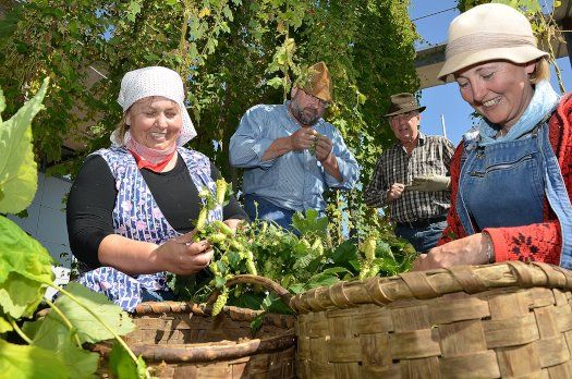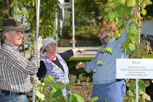 Peu à peu eingeholt werden derweil die Reben im Hopfengarten vor dem Museum von Rudi Pfab und mit Unterstützung von Alois Brummer. Jener brachte extra neue Züchtungen aus Hüll mit, da er nicht wissen konnte, dass heute das Brauen ausfallen muss. Deshalb entgeht dem Publikum sozusagen der Genuss der Special-Flavor-Hopfen-Sorten Hallertau blanc, Hüll melone, Mandarina Bavaria und obendrauf Callista und Ariana.