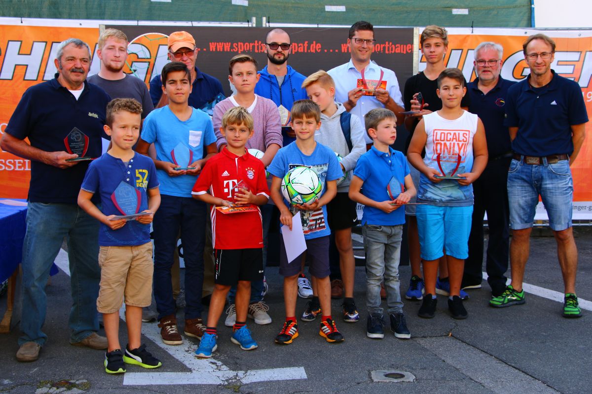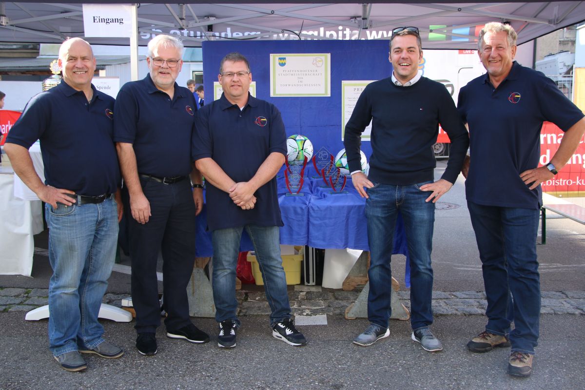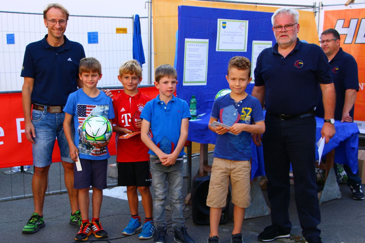 Pfaffenhofener Stadtmeister 2016 im Torwandschießen mit Sponsor Norbert Bauer (ganz rechts) und Vereinsvorstand Robert Schröder (2. v.re.)