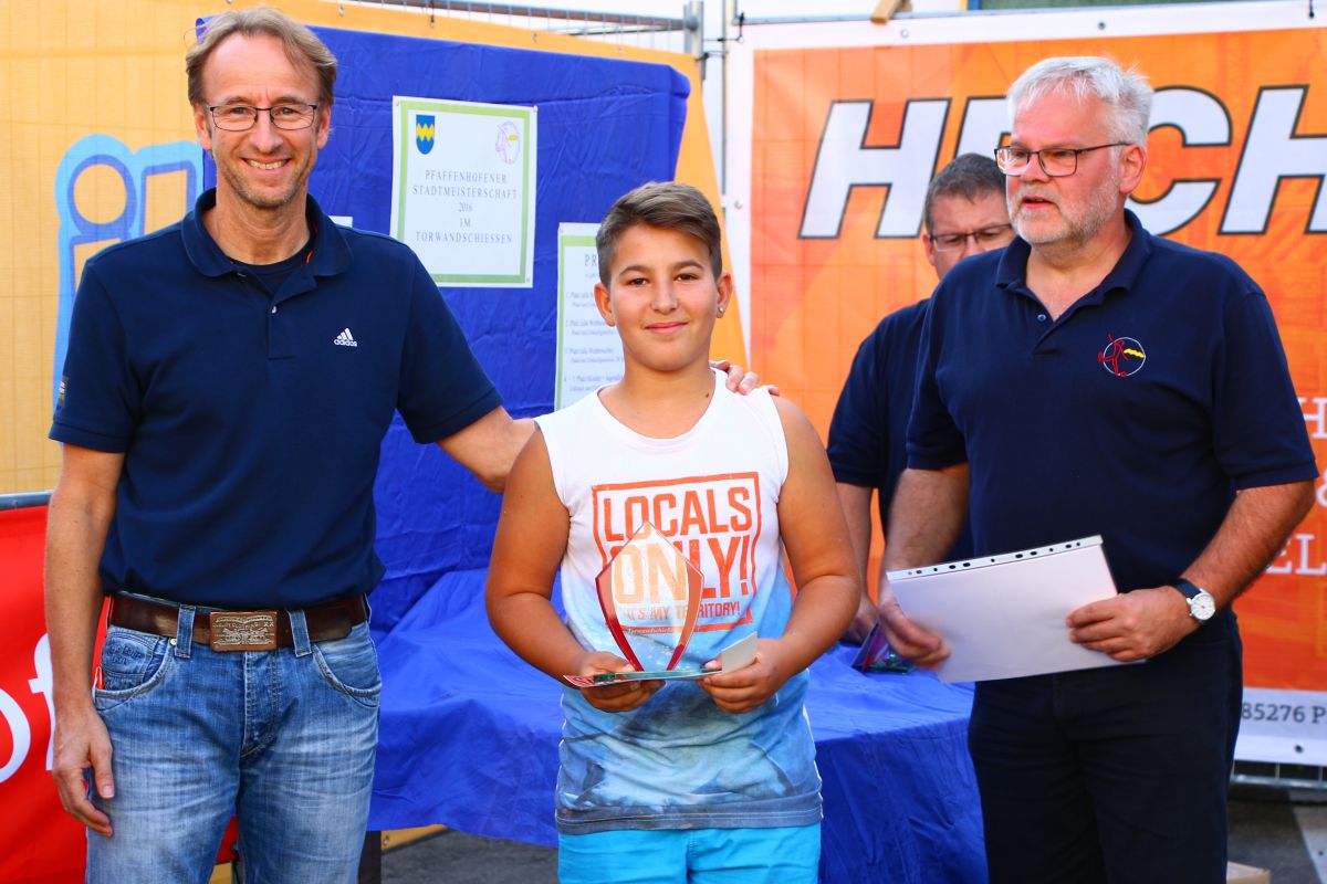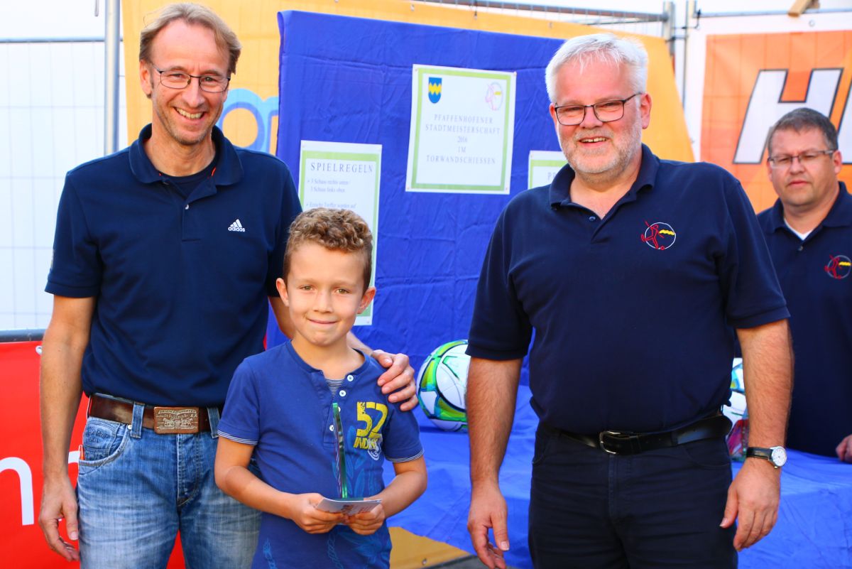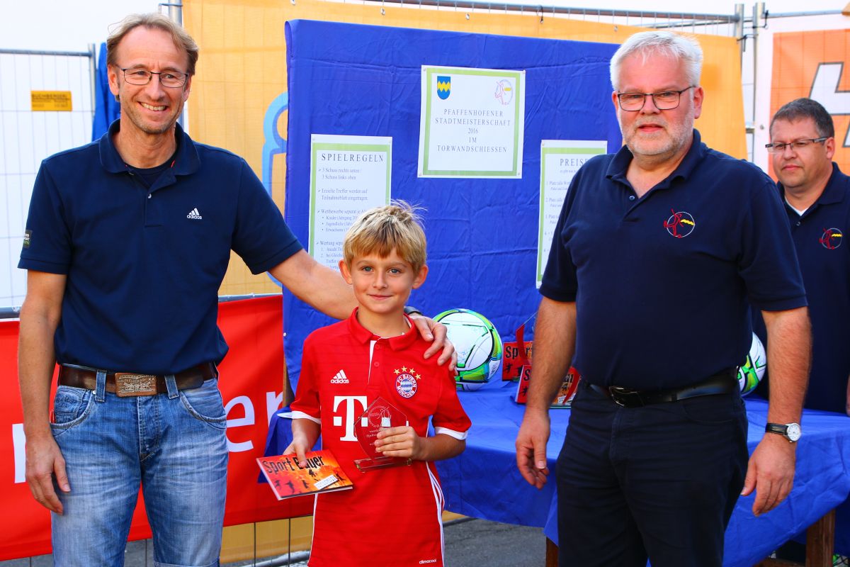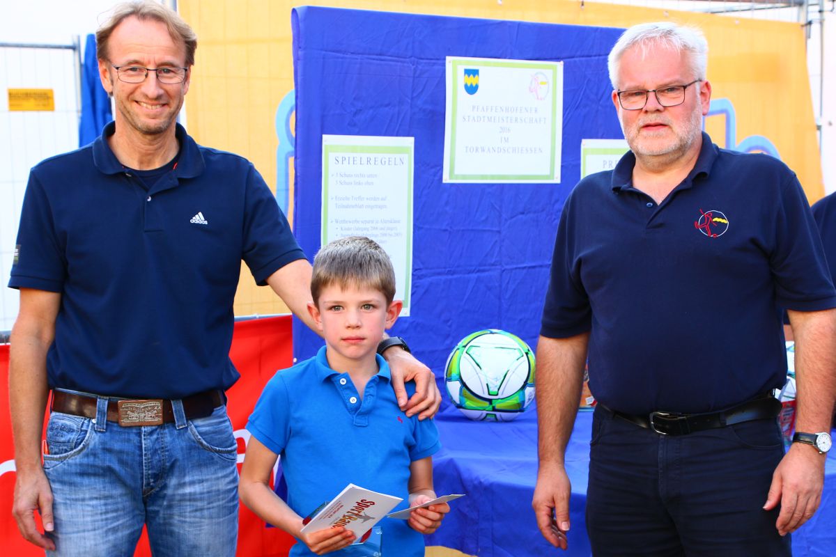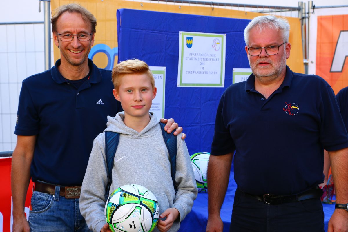Tobias Abeltshauser, 8 Jahre alt und aus Euernbach, heißt der jüngste Pfaffenhofener Stadtmeister 2016 im Torwandschießen. Je einmal traf er rechts unten und links oben und konnte damit Finn Hein (Scheyern, 6 Jahre) und Louis Colbow (Pfaffenhofen, 8 Jahre) auf die Plätze verweisen. Adonis Buzhala ist (noch) 12 Jahre alt und kommt aus Reichertshausen; zweimal versenkte er rechts unten, einmal links oben, was ihm in Summe den Titel bei den Jugendlichen einbrachte. Er erhielt ebenso wie der Zweit- (Maximilian Tomic, 11 Jahre, Allershausen) und Drittplatzierte (Yeremy Colbow, Pfaffenhofen, 13 Jahre) einen wunderschönen Pokal und einen Einkaufsgutschein von Sport Bauer.