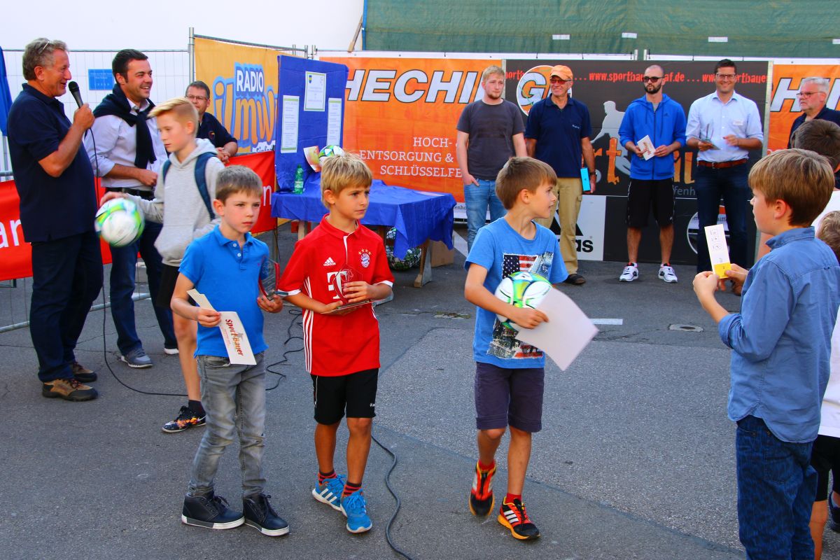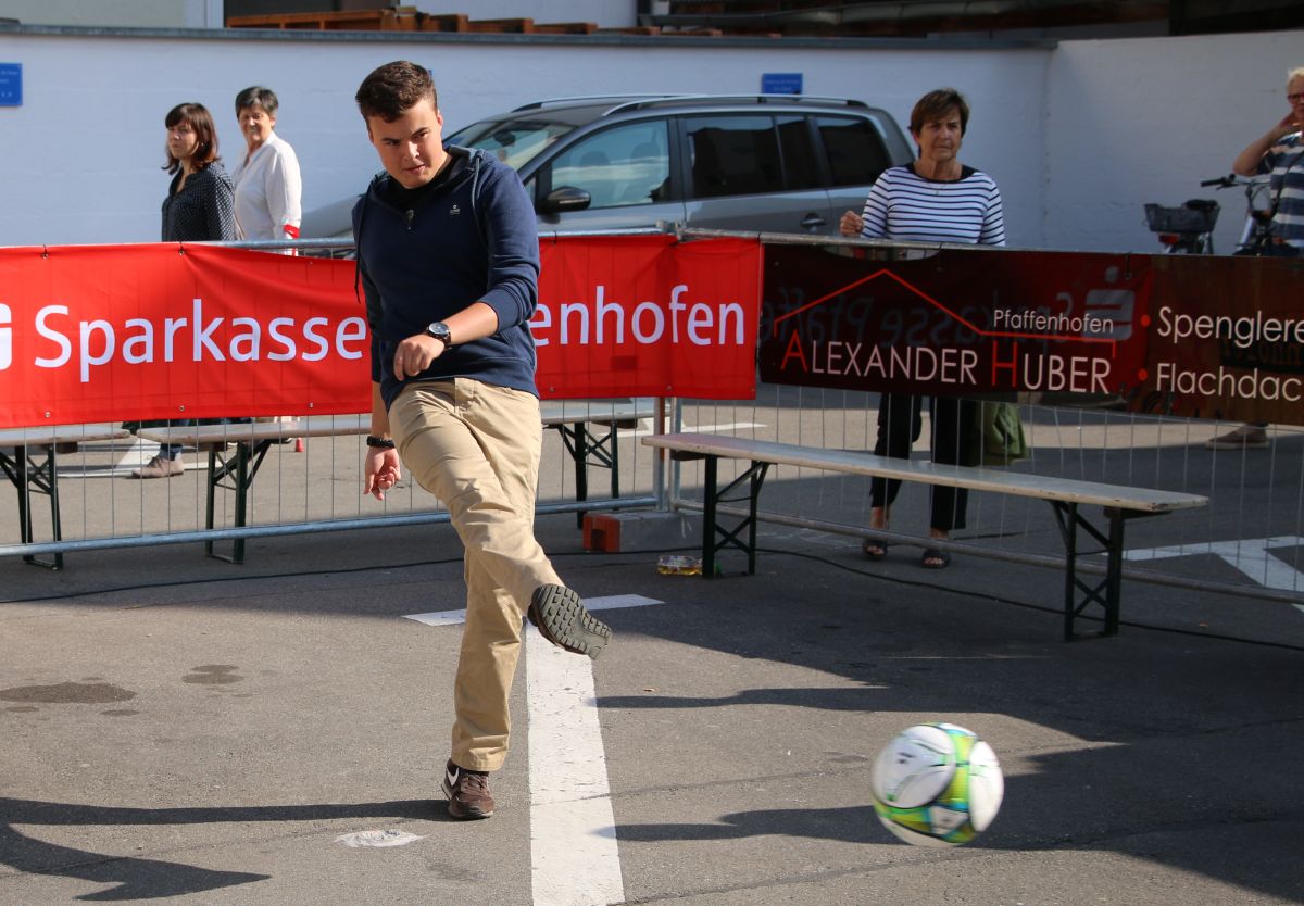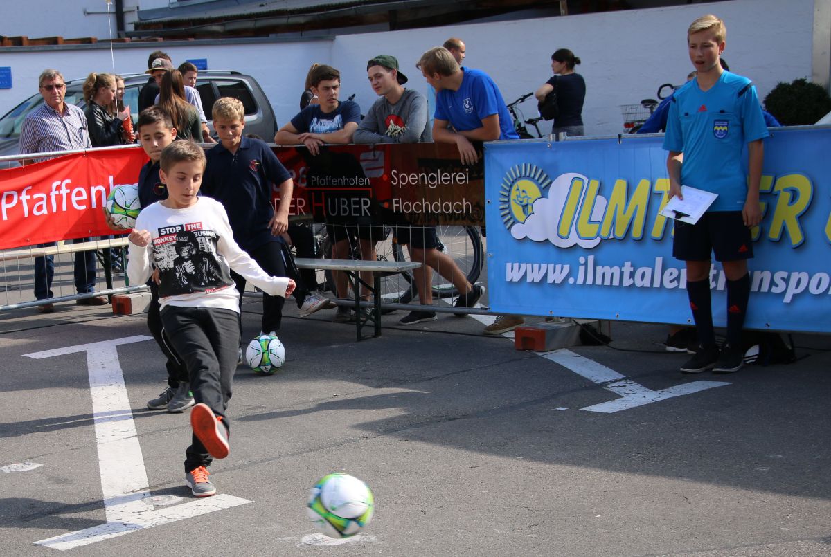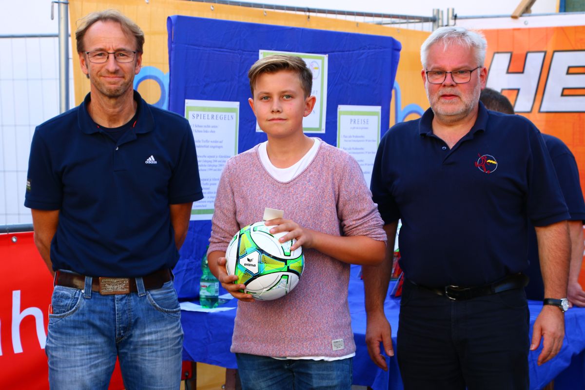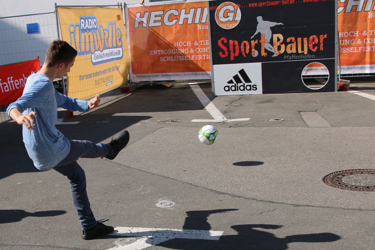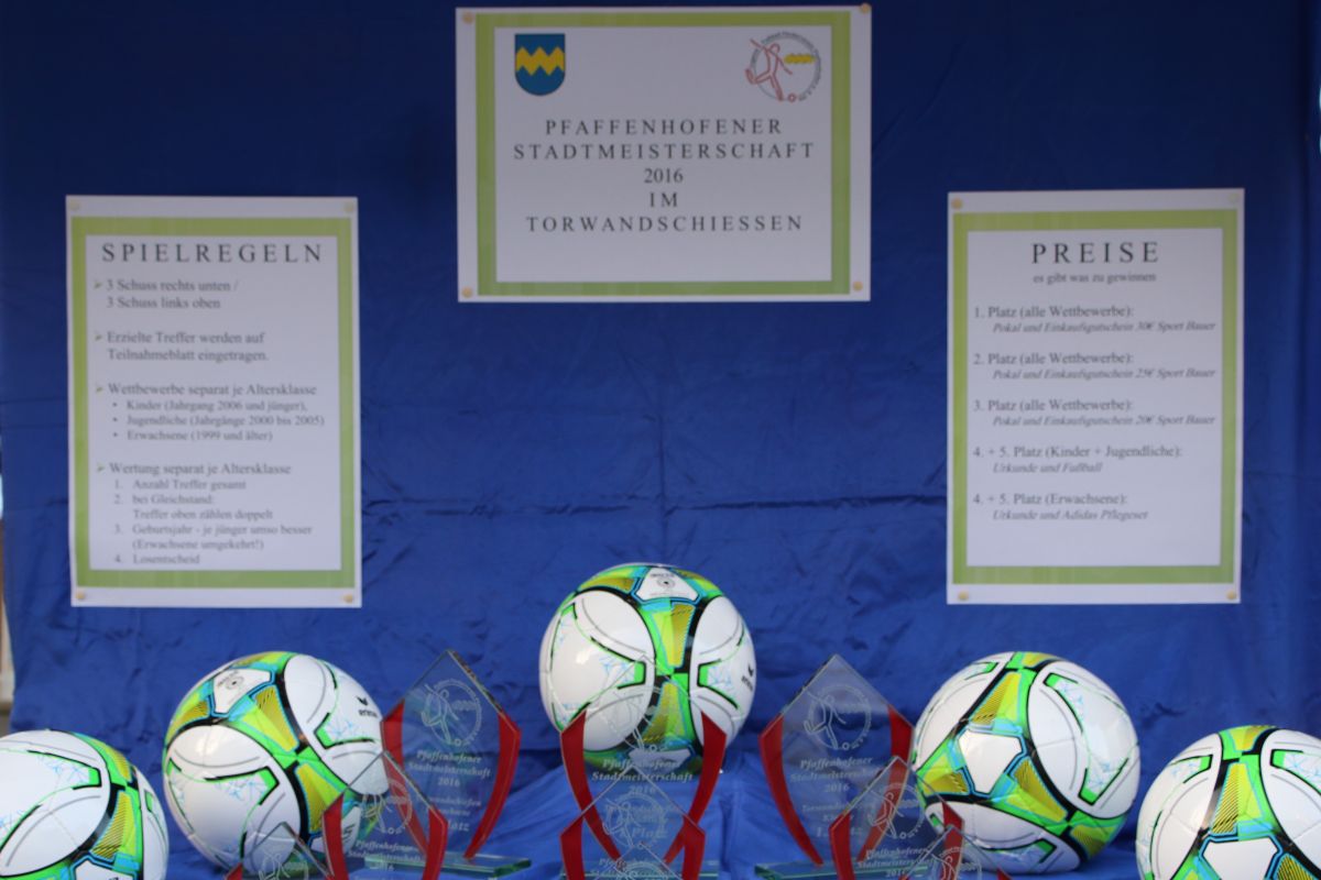 Tobias Abeltshauser, 8 Jahre alt und aus Euernbach, heißt der jüngste Pfaffenhofener Stadtmeister 2016 im Torwandschießen. Je einmal traf er rechts unten und links oben und konnte damit Finn Hein (Scheyern, 6 Jahre) und Louis Colbow (Pfaffenhofen, 8 Jahre) auf die Plätze verweisen. Adonis Buzhala ist (noch) 12 Jahre alt und kommt aus Reichertshausen; zweimal versenkte er rechts unten, einmal links oben, was ihm in Summe den Titel bei den Jugendlichen einbrachte. Er erhielt ebenso wie der Zweit- (Maximilian Tomic, 11 Jahre, Allershausen) und Drittplatzierte (Yeremy Colbow, Pfaffenhofen, 13 Jahre) einen wunderschönen Pokal und einen Einkaufsgutschein von Sport Bauer.