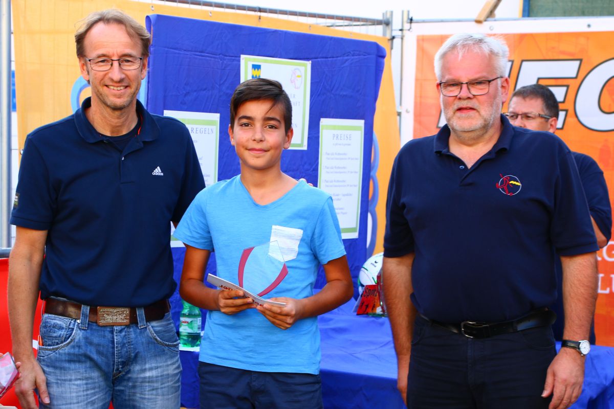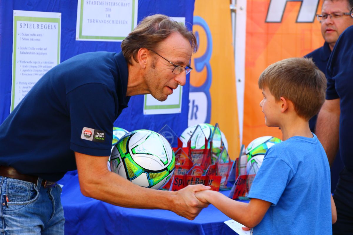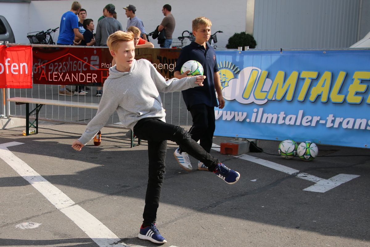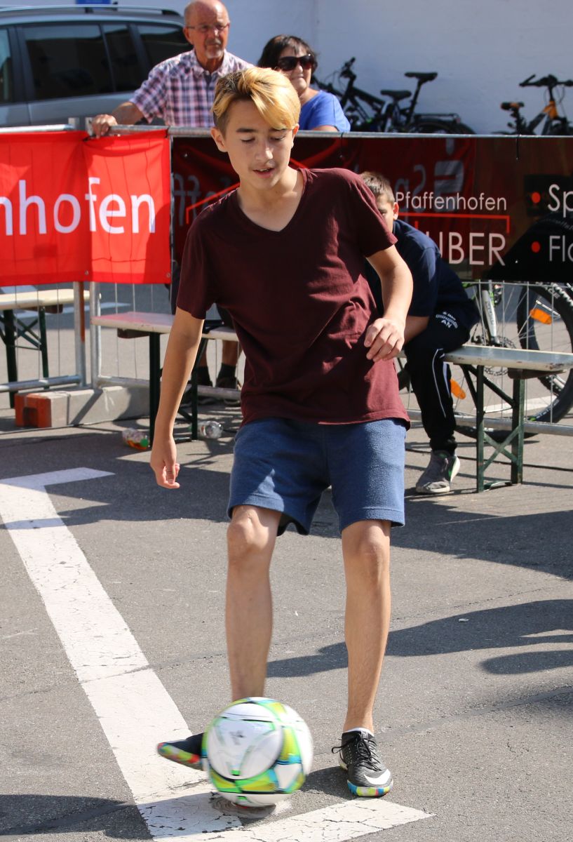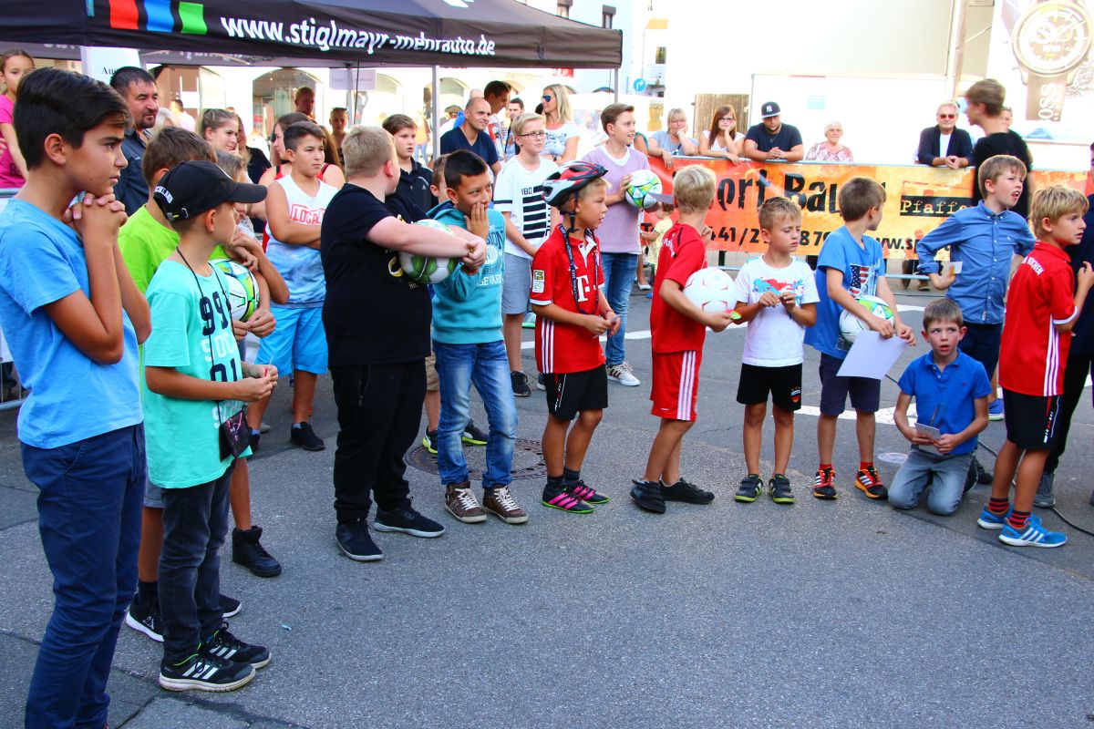 Tobias Abeltshauser, 8 Jahre alt und aus Euernbach, heißt der jüngste Pfaffenhofener Stadtmeister 2016 im Torwandschießen. Je einmal traf er rechts unten und links oben und konnte damit Finn Hein (Scheyern, 6 Jahre) und Louis Colbow (Pfaffenhofen, 8 Jahre) auf die Plätze verweisen. Adonis Buzhala ist (noch) 12 Jahre alt und kommt aus Reichertshausen; zweimal versenkte er rechts unten, einmal links oben, was ihm in Summe den Titel bei den Jugendlichen einbrachte. Er erhielt ebenso wie der Zweit- (Maximilian Tomic, 11 Jahre, Allershausen) und Drittplatzierte (Yeremy Colbow, Pfaffenhofen, 13 Jahre) einen wunderschönen Pokal und einen Einkaufsgutschein von Sport Bauer.