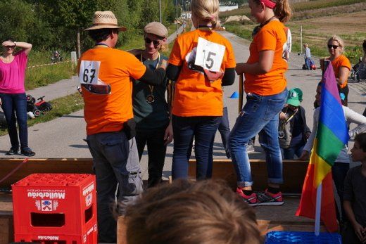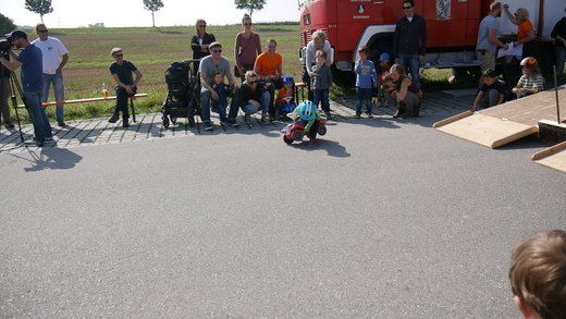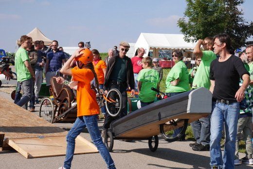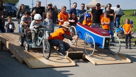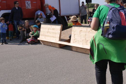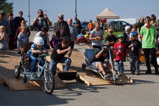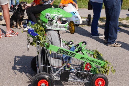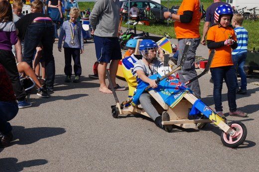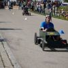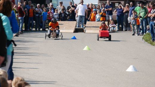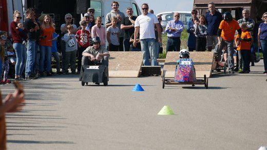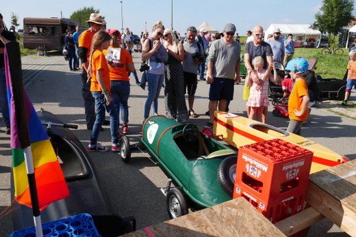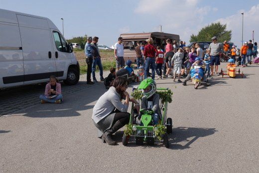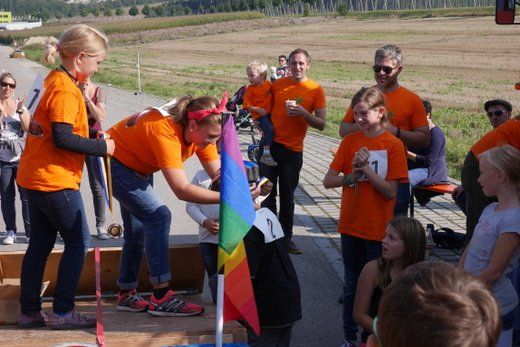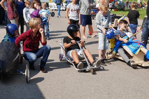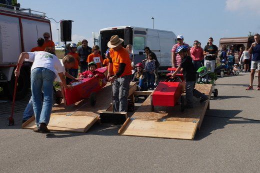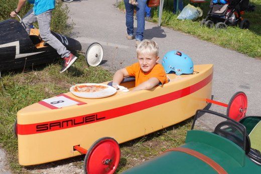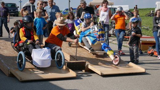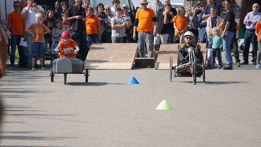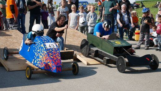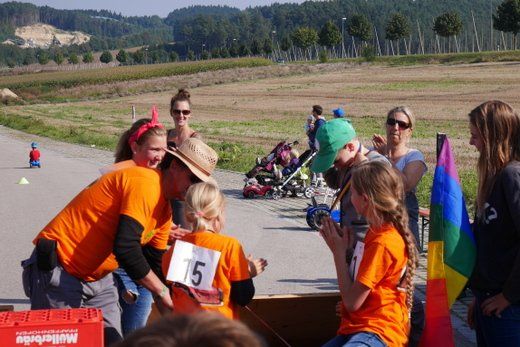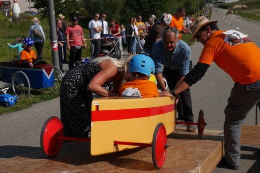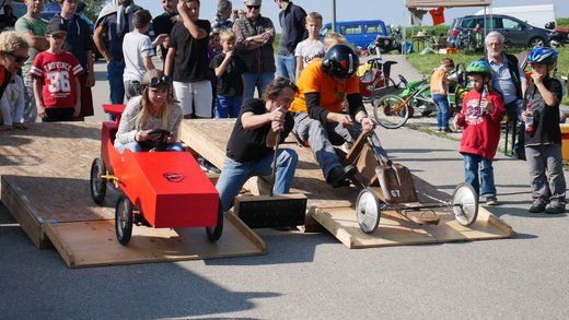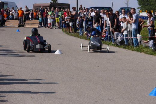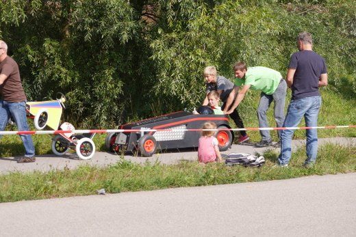 In dreizehn Paarungen mit unterschiedlicher Aufstellung, Innen- und Außenbahn, kamen 27 mutige PilotenInnen an die Startrampe. Das originellste Gefährt bekam natürlich auch einen Preis, über den das Publikum zu entscheiden hatte. Durch das offene Bobbycar Rennen, bei den die Jüngsten auf verkürzter Strecke schon mal ihren Mut bewiesen, waren die Zuschauerränge entlang der Rennstrecke gut gefüllt. Strohballen waren platziert, die Strecke gut sichtbar geteilt und im Zielbereich wurde hoch professionell elektronisch die Zeit bis ins Hunderlste gemessen.