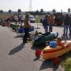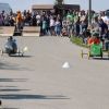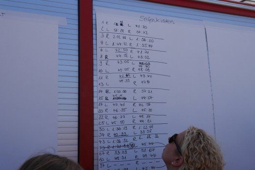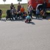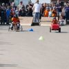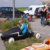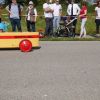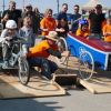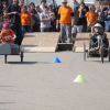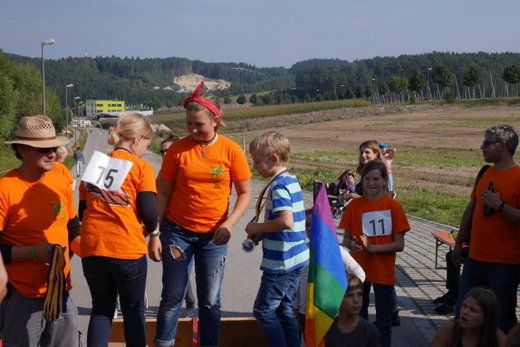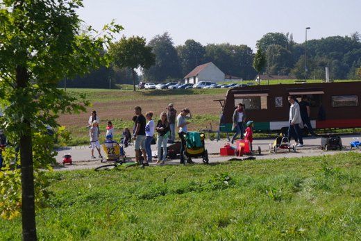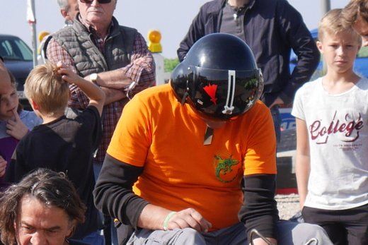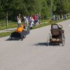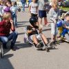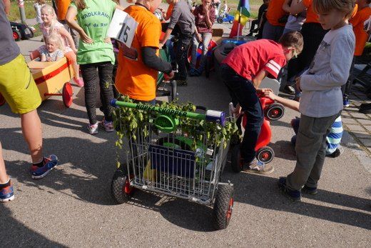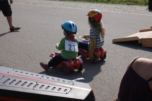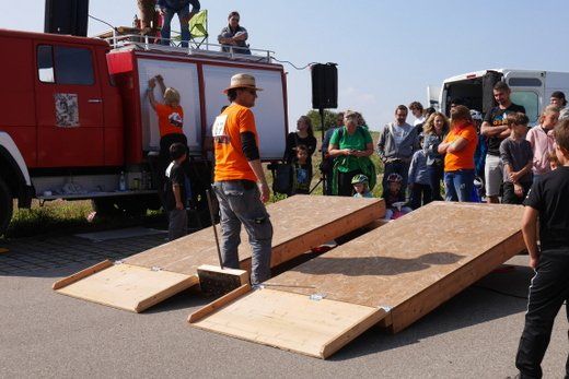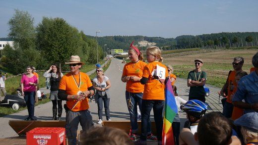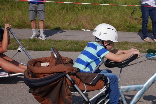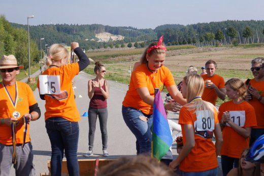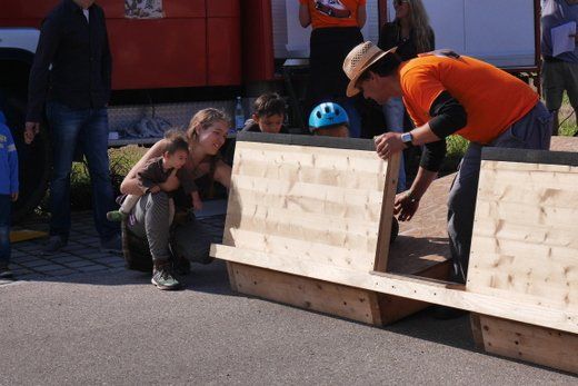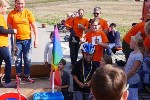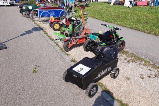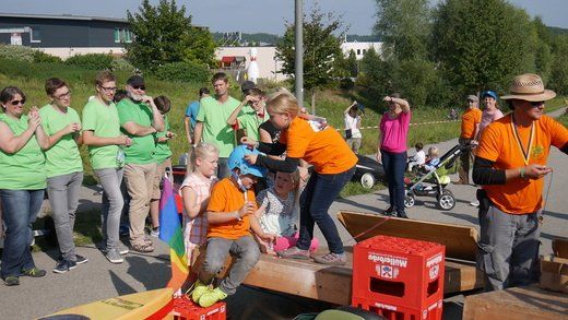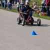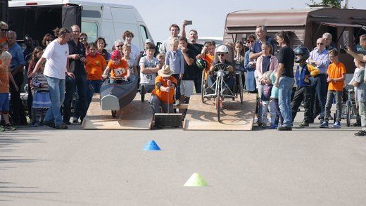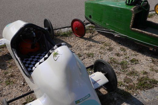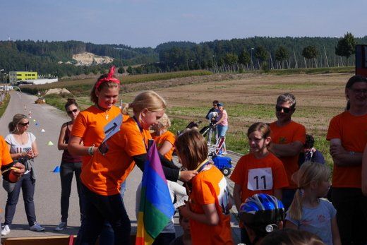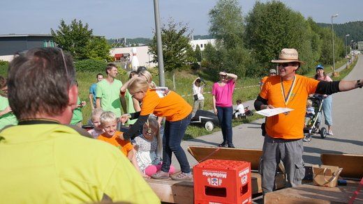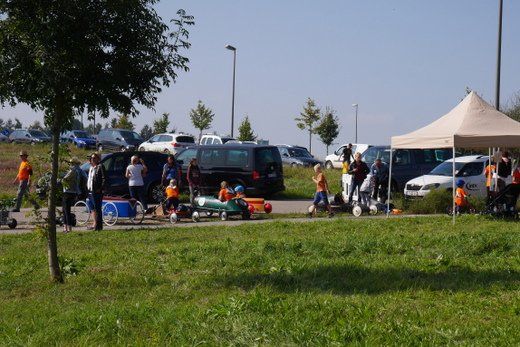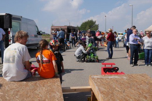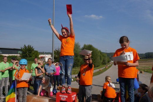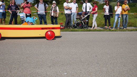 In dreizehn Paarungen mit unterschiedlicher Aufstellung, Innen- und Außenbahn, kamen 27 mutige PilotenInnen an die Startrampe. Das originellste Gefährt bekam natürlich auch einen Preis, über den das Publikum zu entscheiden hatte. Durch das offene Bobbycar Rennen, bei den die Jüngsten auf verkürzter Strecke schon mal ihren Mut bewiesen, waren die Zuschauerränge entlang der Rennstrecke gut gefüllt. Strohballen waren platziert, die Strecke gut sichtbar geteilt und im Zielbereich wurde hoch professionell elektronisch die Zeit bis ins Hunderlste gemessen.
