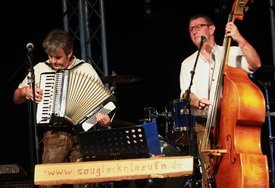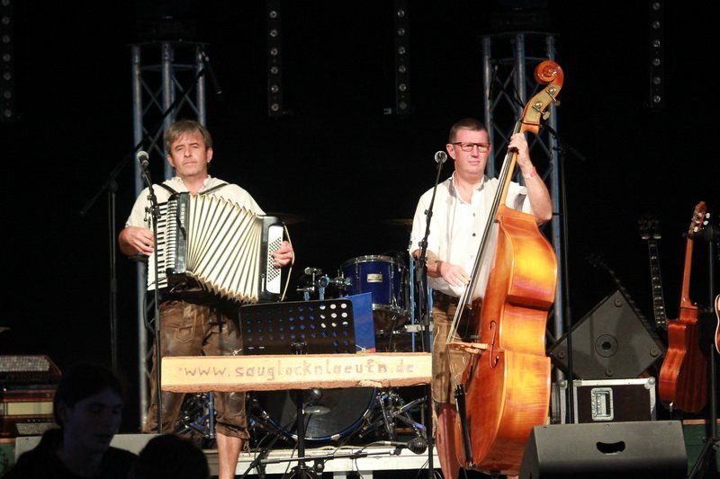 Bereits am Eingang spielte die Band „Muc3“ bayerisch angehauchten Rock und stimmte damit musikalisch in den Abend ein. Nachdem Astrid Elender (FW), die Kulturreferentin des Marktes, in ihrer kurzen Begrüßungsrede bemerkte, dass sich die Gemeinde über den großen Zuspruch der Wolnzacher sehr freue, legten „Sauglocknläutn“ auch schon los. Das Kabarettisten-Duo machte mit dem Publikum ein Gstanzelsingen ganz in der Tradition des Roider-Jackls: „Es ist alles schön geschmiert; zwischen Wolnzach und der Au läuft’s wie d’Sau“, konnten die Leute den Refrain mitsingen. Ritsch Ermeier und Walter Zinkl scheuten sich aber auch nicht, die Politik auf die Schippe zu nehmen.