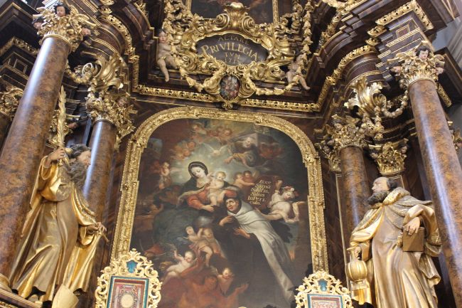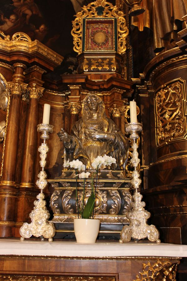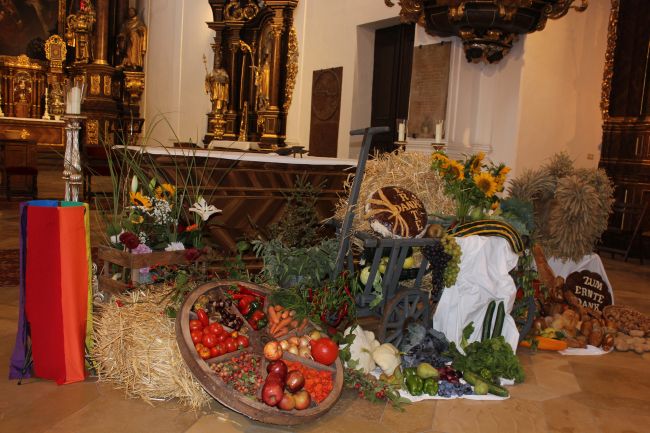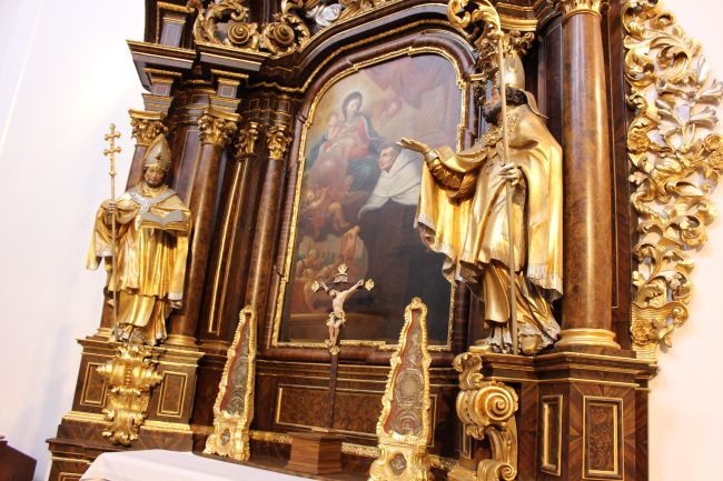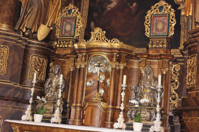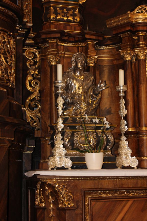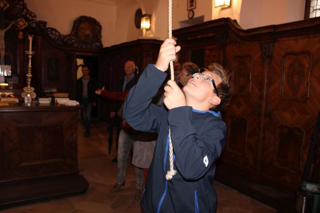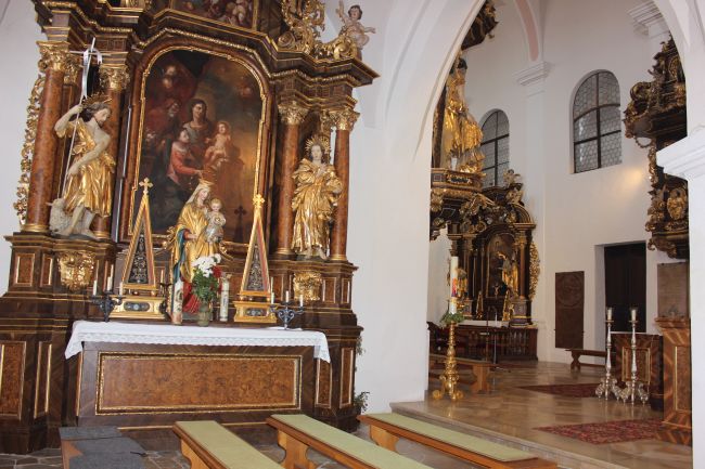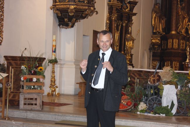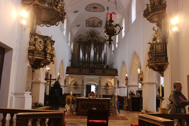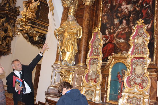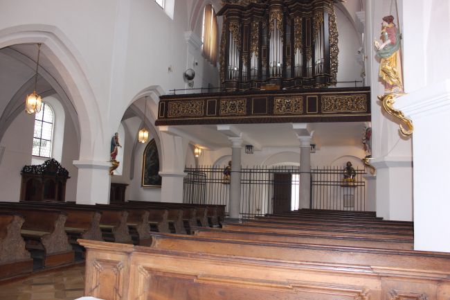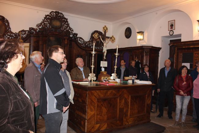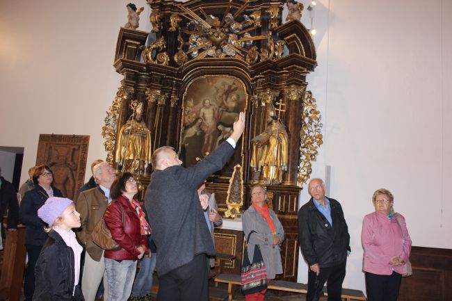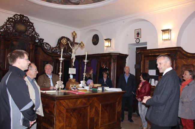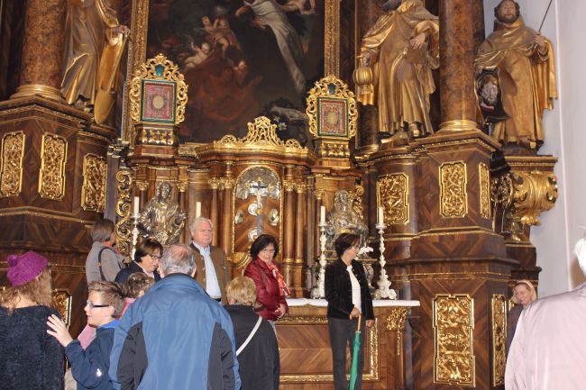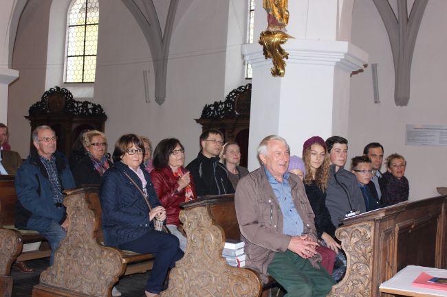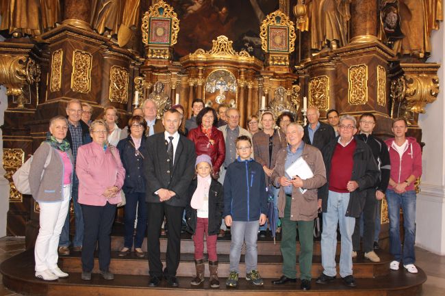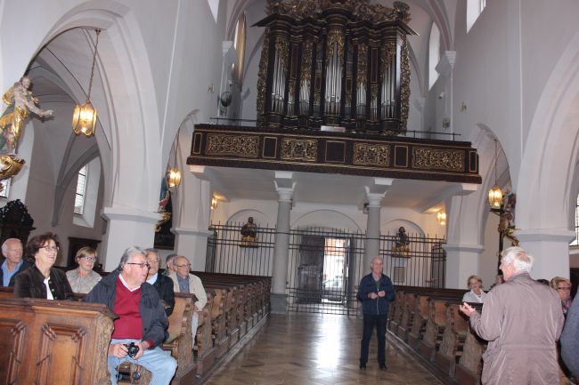 Die rund 30 Teilnehmer lauschten aufmerksam den Ausführungen von Pfarrer Georg Birner, der die Gruppe durch „Stationen“ der Kirche führte und Besonderheiten über die Orgel, diverse Heiligenfiguren und die Sakristei erläuterte. So soll Erzählungen zufolge die Orgel mithilfe eines Flaschenzugs nach oben transportiert worden sein.