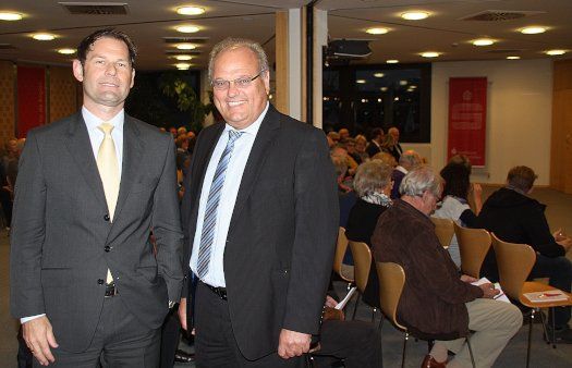 Notar Grosser (l.) mit Sparkassenvorstand Stefan Maier am Vortragsabend „Erben und Vererben – regeln Sie Ihren Nachlass richtig“ im Sparkassen-Casino. Foto: Sparkasse Pfaffenhofen