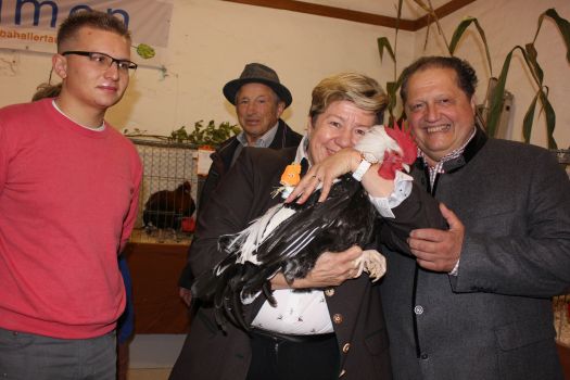 Von 10 Ausstellern wurden insgesamt 140 Tiere, davon 98 Hühner und 42 Tauben begutachtet und prämiert. Die seltene Rasse der La Fleche-Hühner mit einem Kamm aus zwei Hörnern faszinierte auch die zweite Bürgermeisterin. Sie ließ es sich nicht nehmen einen der prächtigen Hähne in ihren eigenen Händen zu halten.