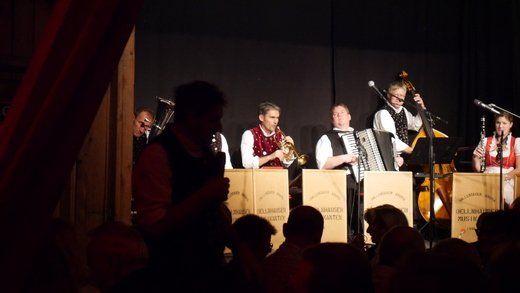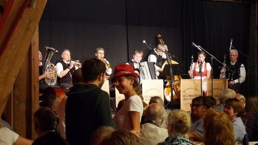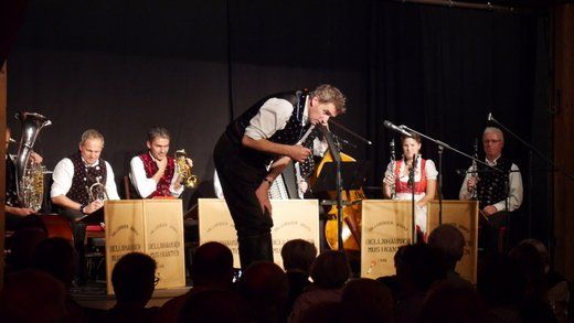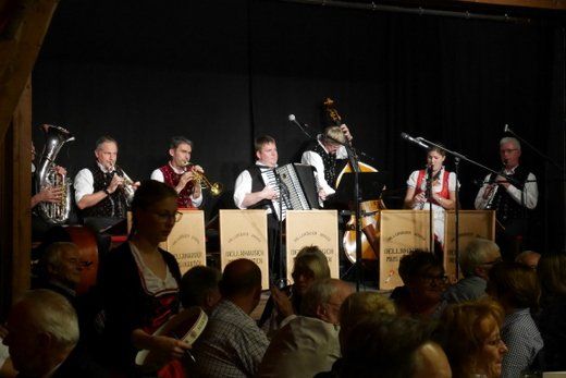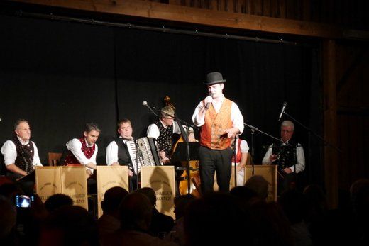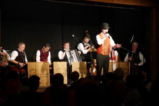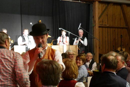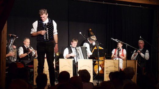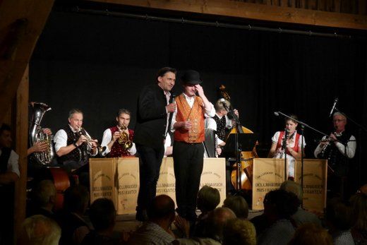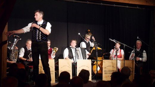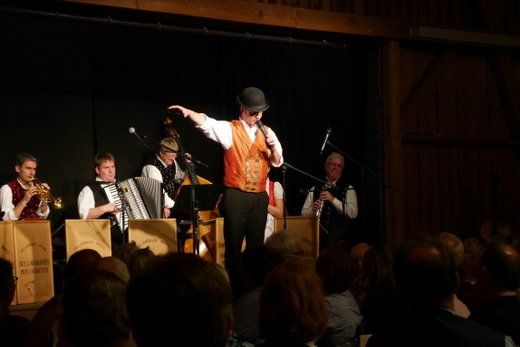 Vorneweg die Dellnhauser Musikanten selber, plus weiblicher Verstärkung an der Klarinette, da Eberwein Michi, lasst hoid nix aus. Gnadenloses Derblecken auf der Bühne und direkt im Publikum, spontan und aus dem Stegreif. Die durchaus gut gemeinte Drohung setzte der Mittermeier Hubert aus Rohr, besser bekannt als "Erdäpfekraut" sofort und effektiv um. Wer gemeint hat, die in der ersten Reihe bekommen eh das ganze Fett weg, sahen sich schwer getäuscht.
