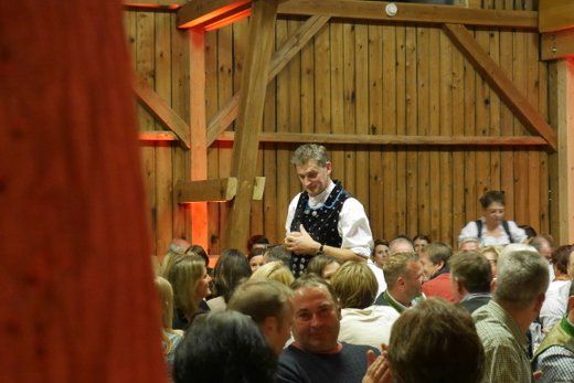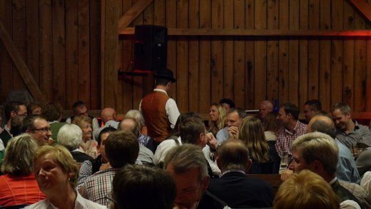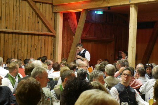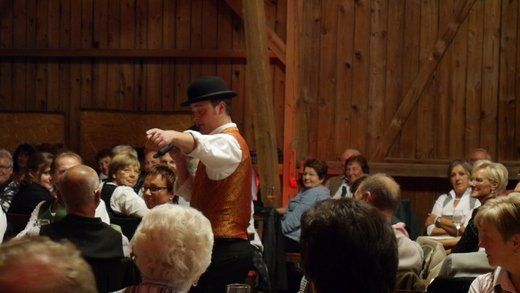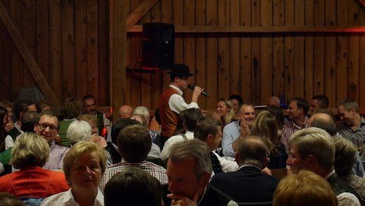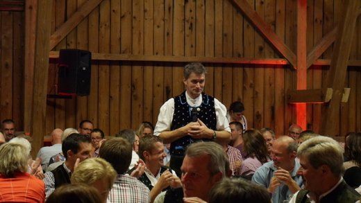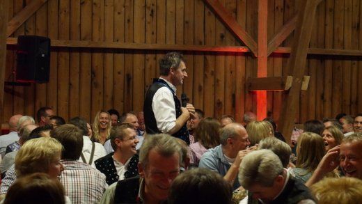 Da Weber Bene aus Cham im Bayerischen Wald, seines Zeichens Hochzeitslader vor Ort, nahm den Staffelstab nach ein paar Zoten von der Bühne gerne auf. Er hat ein anderes Versmass, nebst passender Musik, was der Abwechslung garnienicht schaden tut. Männer ohne Haare auf dem Kopf und Damen mit gutem Blick ins Gebirge werden gerne in den Gstanzlreigen aufgenommen. Auffällige Kleidung die nicht der bayerischen Ordnung entspricht, bekommt besonders viel Kommentar. Hauptsach lustig is und bei zwei Durchgängen kann fast der ganze Saal drankommen.