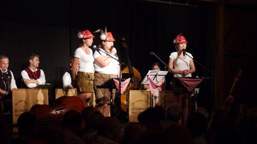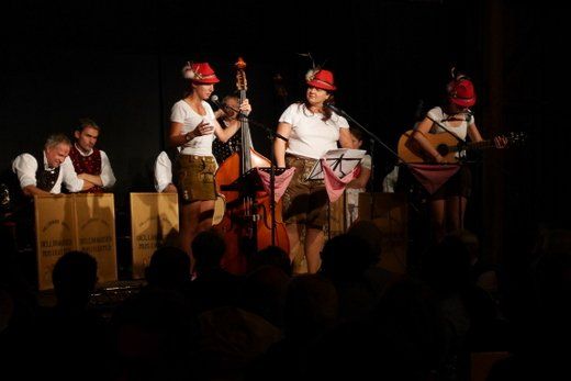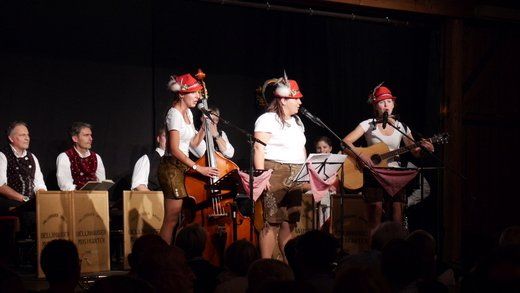 Unterstützung gibt es von den drei Holledauer Mädels der Gruppe Hanghena aus Au in der Hallertau, allesamt aktive Musikerinnen in der dortigen Marktkapelle und seit zwei Jahren unterwegs mit ihrem ersten Musikkabarett-Programm "Emanzipation schiabt o". A so a geile Frau, nein keine der Besucherinnen ward gemeint, genauso wenig wie die Schmetterlinge im Bauch etwas mit dem verliebt sein zu tun hatten. Anerkennung und Verdauung waren die Lösung zu den bestens vorgetragenen Gesangsstücken, die Hanghena hams echt drauf. Ob jetzt eine Talhena magerer ist, weil sie ja nicht so viel steigen muss, oder der Hang selber ein berühmter Auer ist, von dem die Hena abstammen könnten, war nicht zu erfahren.