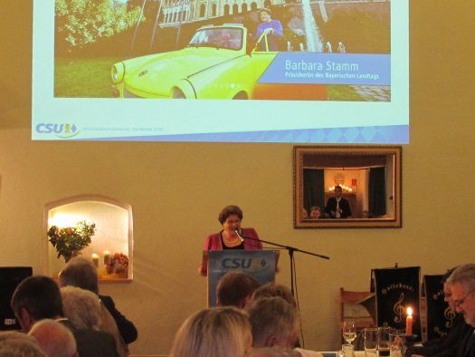 Nach zahlreichen Ehrungen für langjährige Mitglieder wurde Landtagspräsidentin Barbara Stamm begrüßt. Sie sprach in ihrem fast einstündigen Referat allen Mitgliedern ihren Dank aus, für den Zusammenhalt innerhalb der Partei und der Treue der Mitglieder. Dabei ist wichtig zu wissen, „wo wir stehen und wo wir hinwollen“. Ortsverbände unterstützen die Basis, um Demokratie zu leben und zu verteidigen. Sie berief sich auch auf die Leitkultur der Menschen, „wie sehen wir unsere Werte, wie lebe ich sie, wie gebe ich sie weiter“. Man müsse dafür Sorge tragen sich nicht beirren zu lassen, auch wenn einem der Wind ins Gesicht bläst. Wichtig sei ebenfalls, dass man sich Zeit nimmt, um gemeinsam Aufgaben zu lösen. „Bringen sie sich ein, engagieren sie sich“, so die Landtagspräsidentin, auch Ehrenämter sind vorpolitischer Bereich, auch das ist Wertschätzung. Im Anschluss an ihre Rede trug sich Barbara Stamm in das Goldene Buch des Marktes Nandlstadt ein.