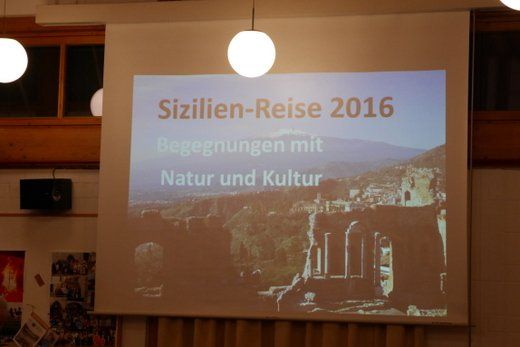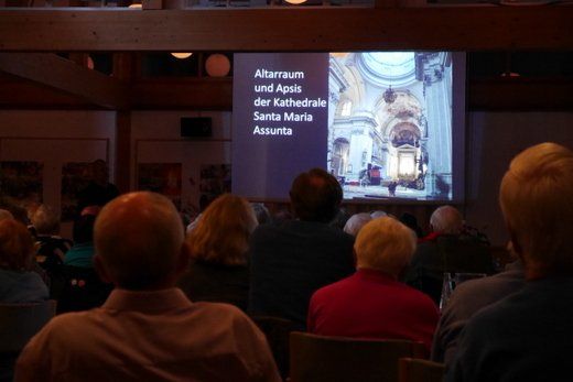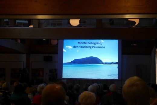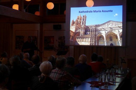 Leider war die Mikrofonanlage ausgefallen und Pfarrer Baldeweg hielt seinen umfangreichen Vortrag über die größte Insel des Mittelmeeres, ohne Verstärkung. In Palermo beginnend, beschrieb er anhand eindrucksvoller, selbstgemachter Fotos, das Land, die Leute, die Architektur, die vielfältige Landschaft und selbstredend, entsprechend viele Kirchen.