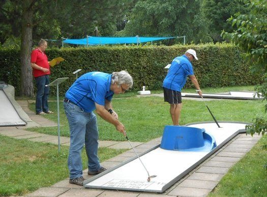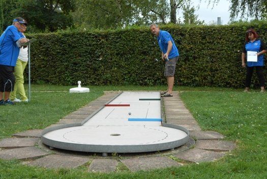 Nicht erwarten kann es Gerhard Pischel (vorne), der sich an der Liegenden Schleife um vorbereitet, noch bevor sein Vereinskollege Karl-Heinz Rühle den Ball aus dem Loch geholt hat. Fotos: Solleder / Miniaturgolf-Club Wolnzach