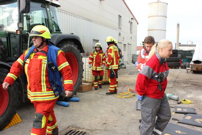 Weiterhin wurde ein Unfall simuliert, bei dem ein Mann eingeklemmt unter seinem Traktor befreit werden musste. Zusätzlich standen Einsatzkräfte des Roten Kreuzes zur Hilfe. Nach Ende der gut einstündigen Rettungsarbeiten, die reibungslos verliefen, wurde alles wieder sorgfältig verpackt.