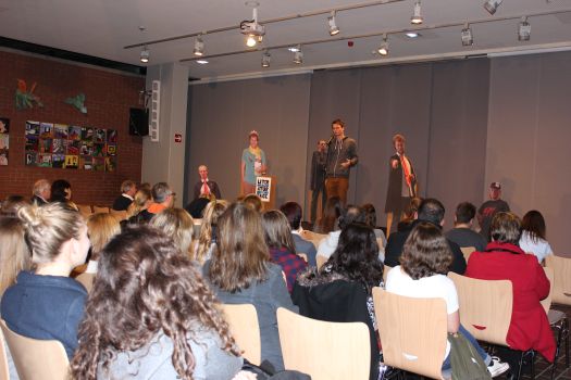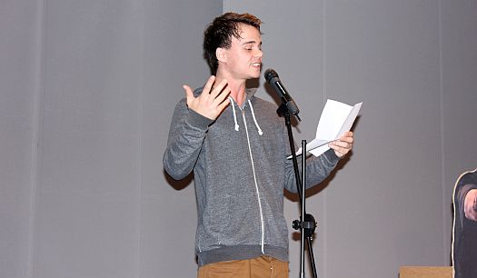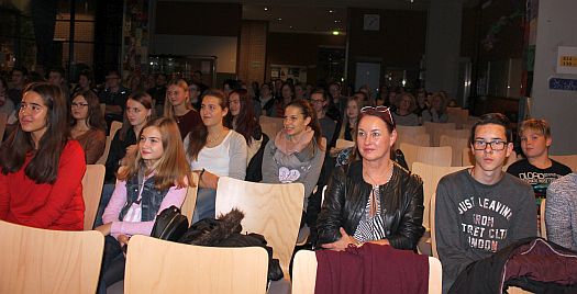 „Ein Poetry Slam ist ein literarischer Vortragswettbewerb, bei dem Texte innerhalb einer bestimmten Zeit einem Publikum vorgetragen werden. Wichtig ist, dass die Texte selbstgeschrieben sind“, erklärte der Gaststar zu Beginn seinem Publikum, unter dem auch einige Schüler waren.
