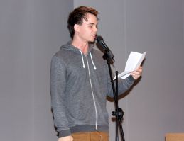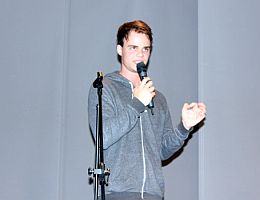 Der Gaststar Nick Pötter ist 23 Jahre alt und kommt aus Berlin. Für ihn war es sozusagen die große Reise nach Bayern. Während er am Vormittag bereits den Schülern der siebten Klasse einen Poetry Slam Workshop unterbreitete, konnte sich die Öffentlichkeit bei der Abendveranstaltung am Dienstag einmal live von dieser modernen Form des Dichterwettbewerbs überzeugen.
