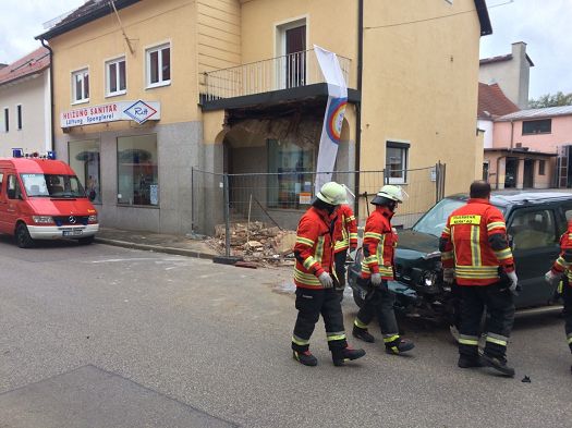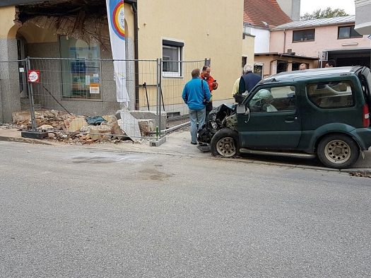 Zu einem aufsehenerregenden Unfall kam es heute Nachmittag in der Ortsmitte von Au: Ein 66jähriger Autofahrer aus Au verlor plötzlich die Kontrolle über sein Fahrzeug, verursacht wahrscheinlich durch einen "Blackout" oder Schwindelanfall und rammte dabei die Säule vor einem Hauseingang, die ein Vordach trug.