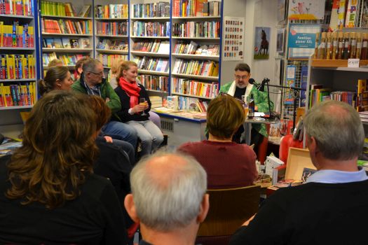 Mit der Lesung in der gut besuchten Buchhandlung war Alexander Bálly im Ort der Opfer und des Hobby-Detektivs Wimmer genau am richtigen Platz. Bally schaffte es bei der Lesung, mit seiner Stimme immer wieder die Dialekte seiner Figuren zu treffen, was die Lesung denn auch etwas auflockerte.
