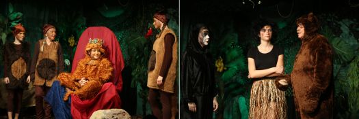 Das Menschenkind Mogli (Susanna Kraemer-Bareirra), Baghira der Panther (Lena Jofer), Balu der Bär (Jörg Retzlaff) oder der Tiger Shir Khan (Franziska Straßer) - wer kennt sie nicht? Gleiches gilt in nicht geringerem Maße für Kaa, die Schlange (Christina Reichhold) oder King Louie, den Affenkönig (Anna Nischwitz). Die Lieder, die 1967 zur Version des Walt Disney Zeichentrickfilms komponiert wurden, kann man getrost als Kids-Hits bezeichnen, so dass es nicht verwunderte, als das Publikum sehr schnell den etwas zaghaften Beginn der Schauspieler einstimmte. "Ich wäre gern wie du" oder "Probier's mal mit Gemütlichkeit" hallte es in einem vielstimmigen Chor durch die Aula.