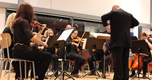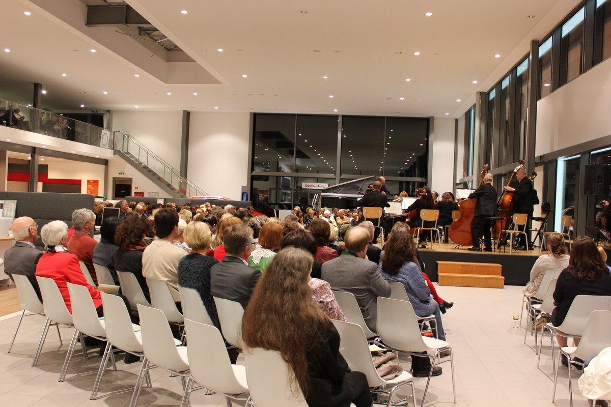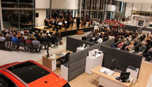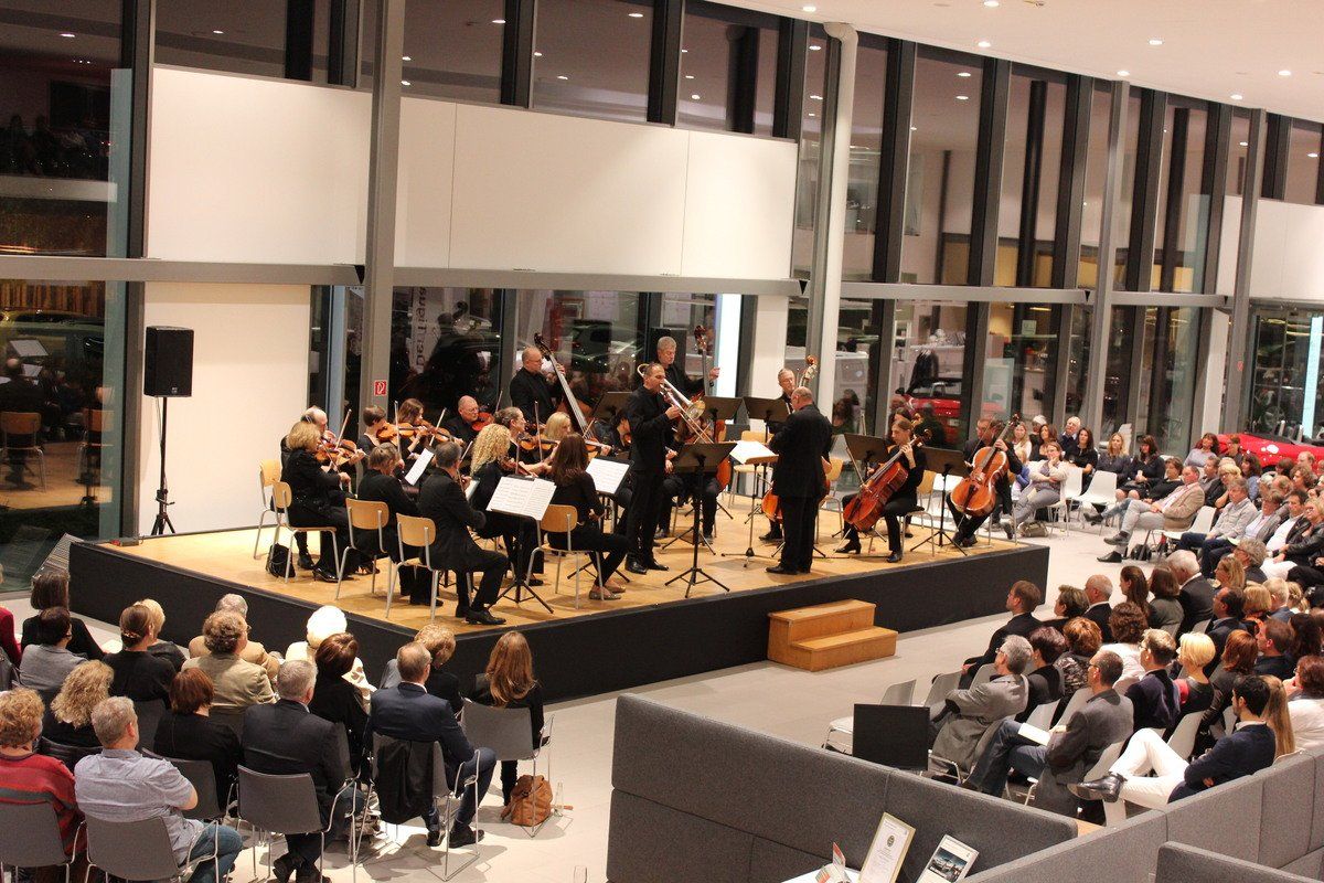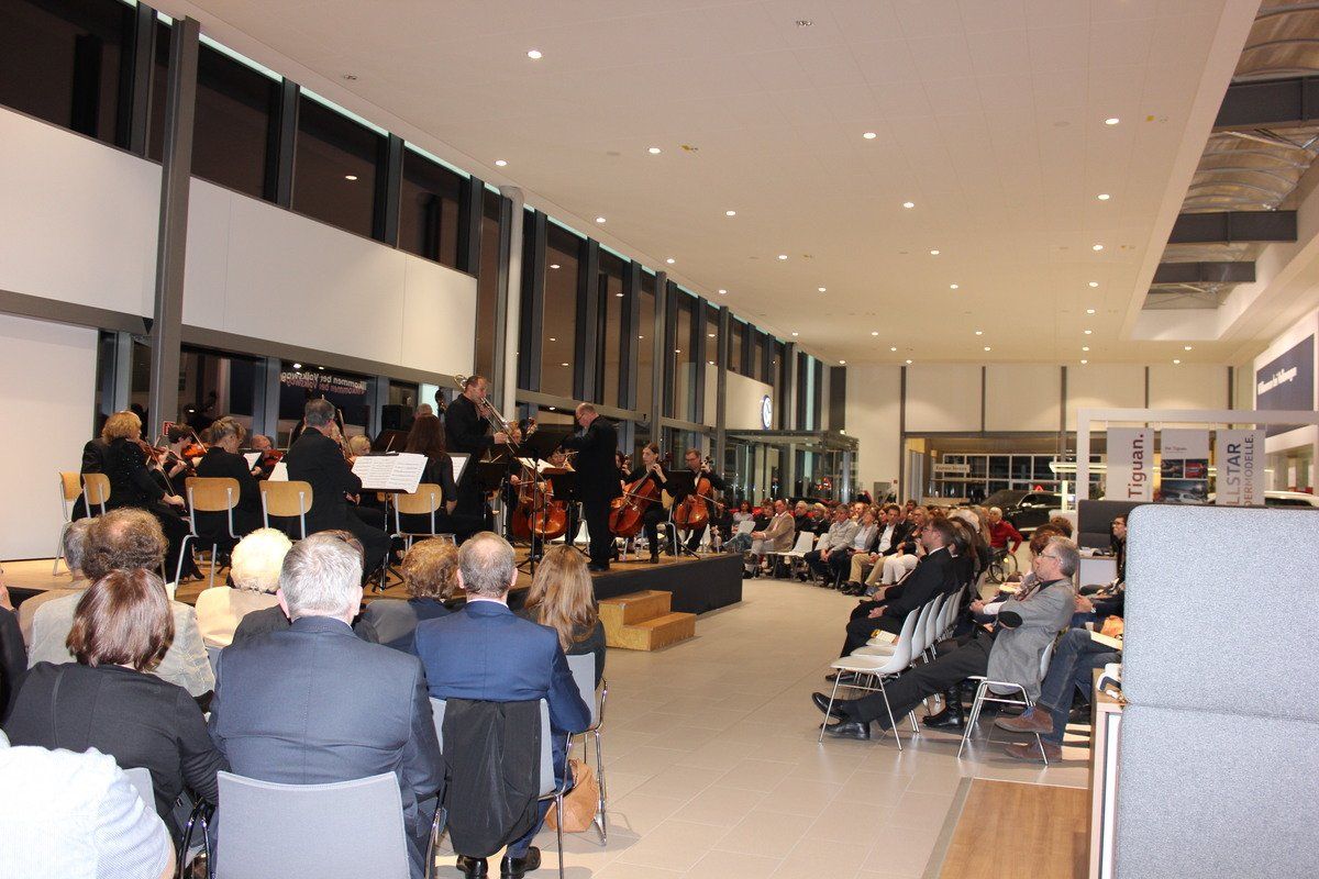 Zugegeben – es ist schon ein etwas ungewöhnliches Erlebnis, wenn ein Kammerochester zwischen VW Beatle, Audi Cabrio und Golf Sports Van konzertiert. Doch dem klanglichen Genuss tat das exotische Flair in keinster Weise Abbruch, so viel kann schon mal gesagt werden. Schon 2015 war das Herbstkonzert des HKO (Hallertauer Kammerorchester) ein großer Publikumserfolg, der in diesem Jahr mit dem Stadlkonzert im Sommer und dem Herbstkonzert letzten Samstag eine glorreiche Fortsetzung fand.