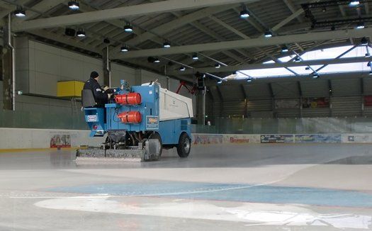 Etwa fünf bis sechs Mal im Jahr musste man in der Vergangenheit eingreifen, um Stromschwankungen in Folge eines Gewitters aufzufangen. Schließlich sind hier Chemikalien im Spiel, in erster Linie Ammoniak. In flüssiger Form wird dieser Stoff von der Steueranlage in ein Kilometer langes Rohrsystem gepumpt. Die Rohre liegen in wenigen Zentimetern Abstand unter der großen Betonfläche, auf der das Eis aufgebaut wird. Minus 14 Grad kalt wird die Betonpiste durch das flüssige Ammoniak, das aus dem Verdichter kommt und über die Pumpen unter dem Beton verteilt wird. Der ECP bringt darauf einen Sprühnebel aus Wasser auf. So wird das Eis dann Schicht für Schicht aufgebaut. Das dauert bis zu drei Tage. Zwei Zentimeter unter der Oberfläche müssen dann noch Markierungen ins Eis eingelassen werden, mit Bändern und Farben, damit die Eishockeyspieler Orientierung auf dem kalten Spielfeld haben.