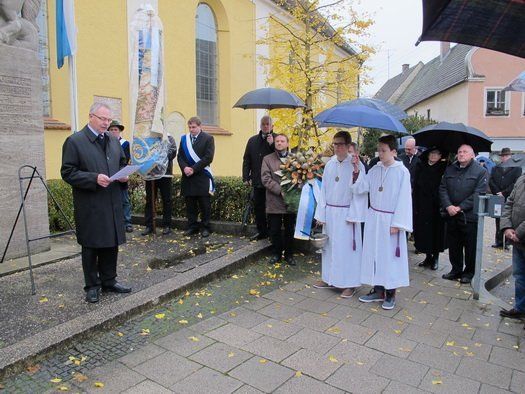 Der Krieger-, Soldaten- und Kameradenverein legte am Sonntagvormittag am Kriegerdenkmal einen Kranz nieder – wie alle Jahre und immer mit guter Beteiligung der Bevölkerung, der Bürgermeister und Gemeinderäte. Voraus ging der Gedenkgottesdienst, den BGR Pfarrer Johann Braun nutzte, über den 71-jährigen Frieden in Deutschland nachzudenken. Dazu nannte er die Zahl aller großen Kriege in den jeweiligen Epochen. Hans-Georg Kaempf vertiefte diese Gedanken in seiner Ansprache vor der Kranzniederlegung: Deutschland ist an Kriegen beteiligt, es sterben Deutsche. Die laufenden Kriege fordern Tausende von Menschenleben.