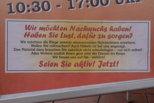 Für Nachwuchs soll der geschätzte Besucher sorgen, heißt es zumindest am Eingang. Nicht was sie meinen, Nachwuchs beim Handarbeitsteam wird gesucht. Die alten Fähigkeiten sollen nicht aussterben, die Damen wollen ihre Kunst durchaus weitergeben. Also morgen Sonntag ist noch Zeit, hingehen staunen, kaufen, Brotzeit machen.