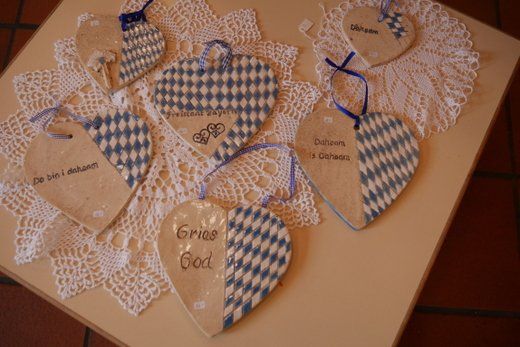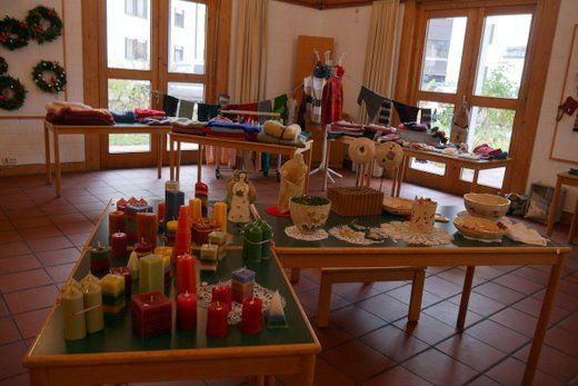 Kerzen in allen möglichen Farben und seltsamsten Formen, Keramik, sogar in bayerischer Art, geflochtene Kränze, „Wadelstrümpf“, Trachtenjanker, Salzteigkunstwerke, Likör und „Marmalad“, wer da nichts findet ist selber schuld. Der kleine Saal hat aber auch noch Platz für einen gemütlichen Plausch und Fachfrauen.