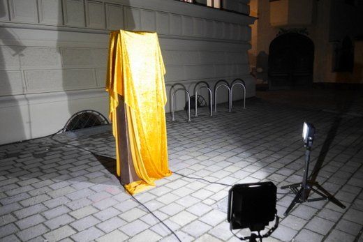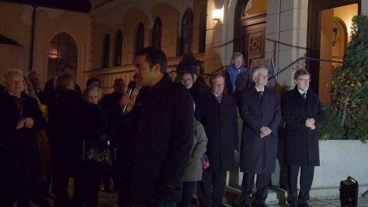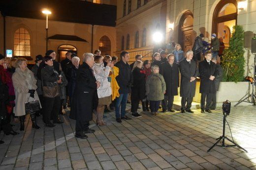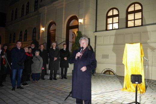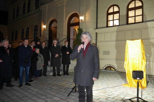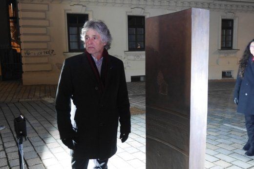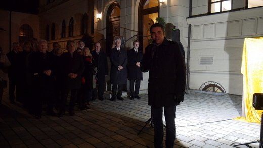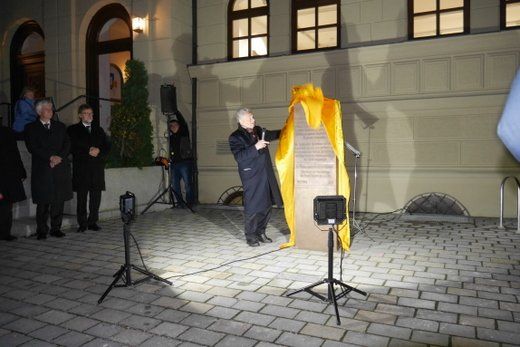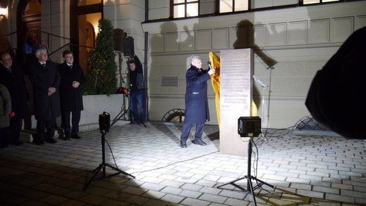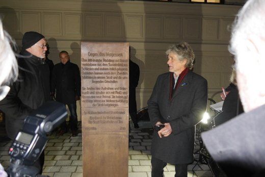 Nach einem kurzen Vorwort von Bürgermeister Thomas Herker zur Thematik, Vertriebene in Pfaffenhofen, wurde das Bronzedenkmal des Schrobenhausner Künstlers Richard Gruber, enthüllt. Der Künstler bedankte sich und nahm Stellung zum Text und dem Relief auf der Rückseite. Einen (Haus) Baum kann man nicht mitnehmen und doch wird er immer in Erinnerung bleiben, das alte Volkslied aus der Winterreise war sein Beitrag zum Thema.