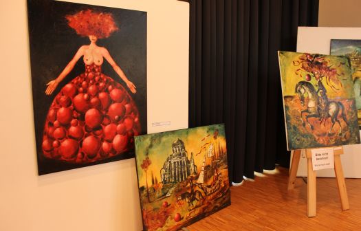 Bereits am Donnerstagabend war Auftakt der Vernissage, wo sich zahlreiche Künstler und Kunstinteressenten einfanden, um die ausgestellten Werke in Augenschein zu nehmen. Vhs-Vorsitzende Hannelore Langwieser und Wolfgang Dangl, Sprecher der Gruppe Kunst, begrüßten den in Budapest lebenden Gastausteller András Györfi sowie 39 weitere Künstler. Györfi´s Werke und Figuren stellen oft den Künstler selbst dar. Die Landschaften sind grotesk, voller Überraschungen und erzählen ihre eigene Geschichte. Immer wieder tauchen als Erkennungsmerkmal rote Kugeln, nahezu als „Tomaten“ interpretierbar, auf.