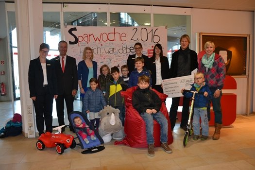 Es galt, dem tatsächlichen Inhalt von 150 Euro in Scheinen und Münzen in der durchsichtigen Weltkugel möglichst nahe zu kommen. Die Kinder hatten aber nicht nur großen Spaß an der Schätzaktion. Sie freuten sich in der Sparkassen-Hauptstelle auch sehr darüber, dass sie sich für die Sparwoche 2016 auf einem riesigen Plakat verewigen durften.