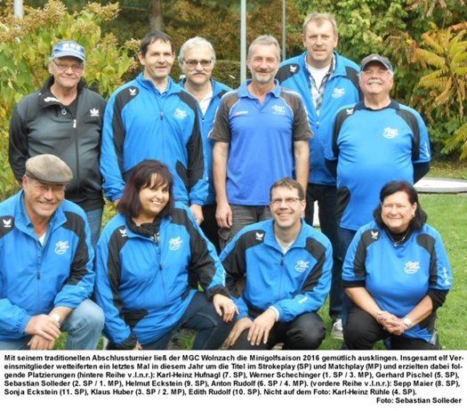 Die Minigolfsaison 2016 offiziell beendet hat Mitte Oktober der MGC Wolnzach mit seinem traditionellen Abschlussturnier. Dabei ging Werner Schechinger beim Strokeplay siegreich hervor und Sebastian Solleder sicherte sich zum 5. Mal in Folge den Vereinspokal beim Matchplay.