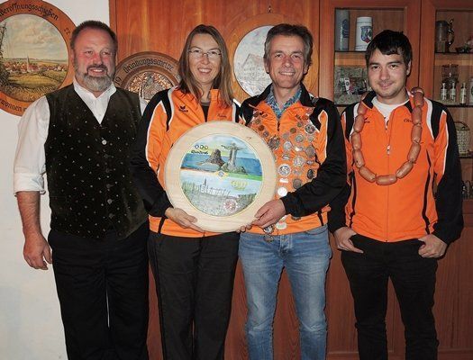 Vorjahreskönigin Karin Förtsch überreicht die von ihr handbemalte und gestiftete Königsscheibe an den neuen Schützenkönig, ihren Ehemann Michael Förtsch, der mit einem 89,1 Teiler siegte. Thomas Hadler (r.) wurde Vizekönig. Schützenmeister Martin Rieder (l.) gratuliert. Foto: Hadler / Sportschützen Niederlauterbach