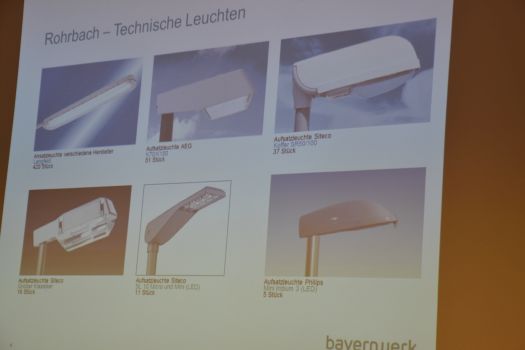 Doch bevor die Gemeinderäte sich die verschiedenen Lampentypen näher anschauen konnten, wurden sie von Bayernwerk-Mitarbeiter Josef Bestle, der auch für die Betreuung Rohrbachs zuständig ist, über die verschiedenen Lampentypen, deren Technik, Lichtstärke, Lichtfarben und optimale Mastenabstände informiert. Derzeit ist der überwiegende Teil der Rohrbacher Straßenlampen mit Natriumdampf-Technik ausgestattet. Im Zuge der Erneuerung von Straßenlampen bzw. bei Installation neuer Straßenlampen soll die LED-Technik eingesetzt werden, die nicht nur heller ist als die Bestände, sondern im Laufe der Jahre deutlich preisgünstiger geworden ist. Lagen die Preise früher noch bei 3.000 bis 5.000 Euro, so gibt es bereits LED-Lampen für 300 bis 800 Euro, je nach Design.