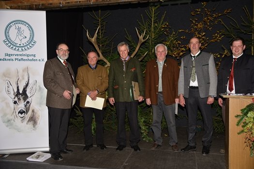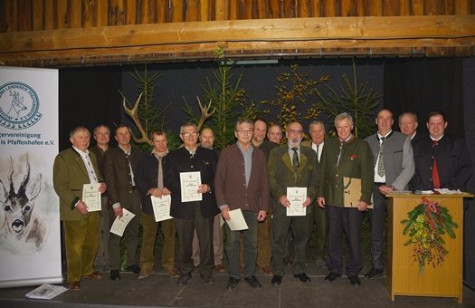 Für 40 Jahre Zugehörigkeit zur Jägervereinigung geehrt wurden: Marion Freifrau von Cetto, Karl-Heinz Russ, Johann Thalmaier, Martin Thalmaier, Kurt Fahn, Rudolf Hegen, Lorenz Kreitmayr, Reinhard Mengele, Benno Oberhauser, Franz Oberhauser, Isidor Kiermeier und Josef Radlmeier.